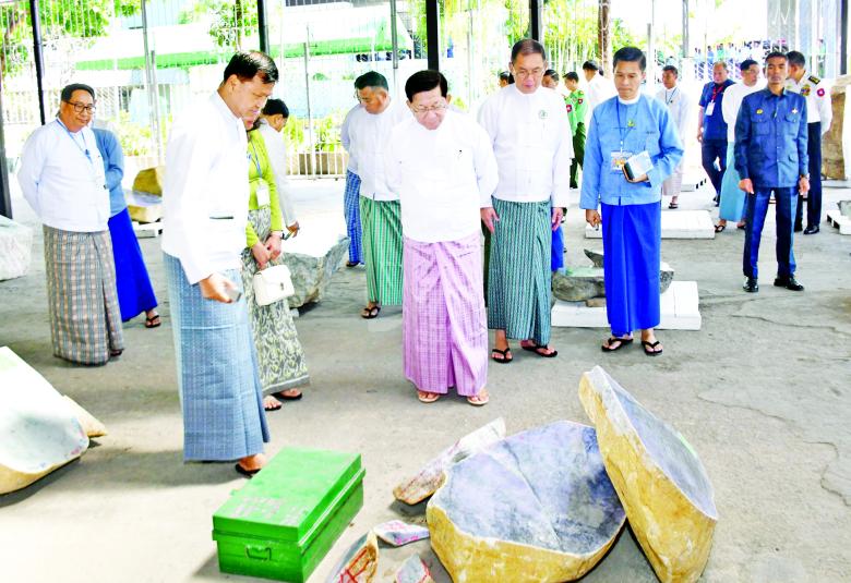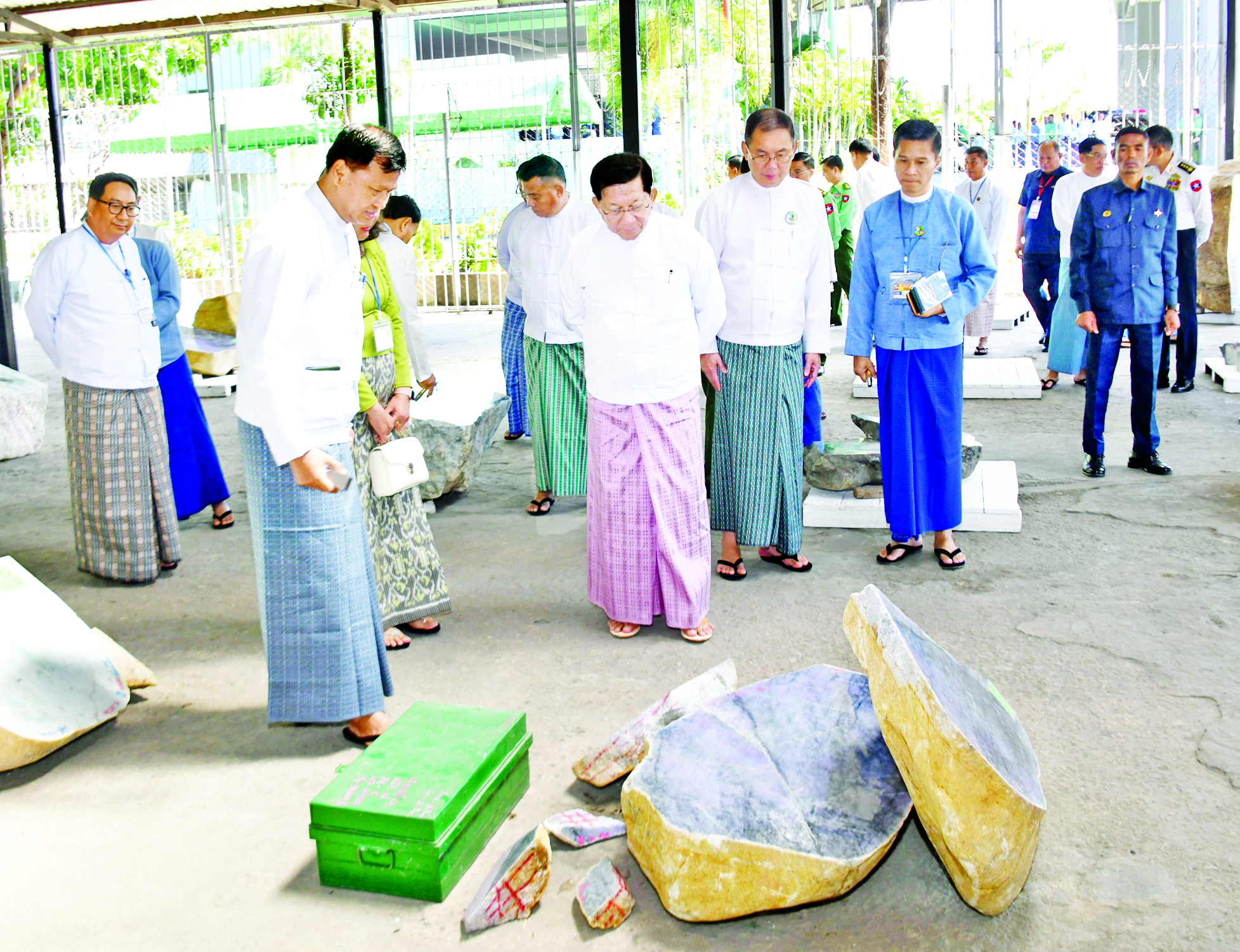 ထို့နောက် နိုင်ငံတော်ယာယီသမ္မတ နိုင်ငံတော်လုံခြုံရေးနှင့် အေးချမ်းသာယာရေးကော်မရှင် ဥက္ကဋ္ဌနှင့် အဖွဲ့ဝင်များသည် ပုဂ္ဂလိက ကျောက်မျက်ရတနာအချောထည် အရောင်းပြခန်းများ ဖွင့်လှစ်ရောင်းချနေမှုကို လိုက်လံကြည့်ရှုအားပေးပြီး ခန်းမအပြင်ဘက်တွင် ခင်းကျင်းပြသထားသည့် ကျောက်စိမ်းရိုင်းအတွဲများကို လိုက်လံကြည့်ရှုစစ်ဆေးသည်။