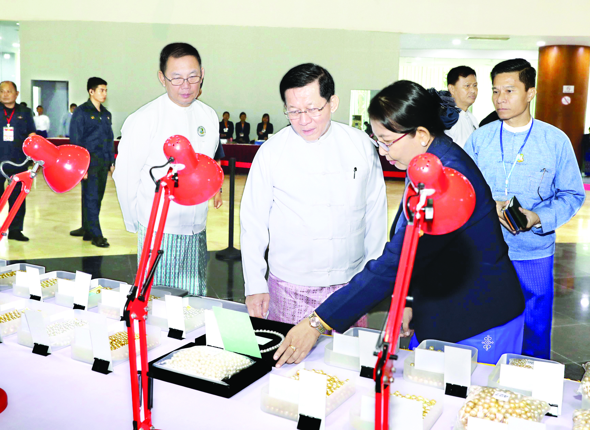 ယင်းနောက် နိုင်ငံတော်ယာယီသမ္မတ နိုင်ငံတော်လုံခြုံရေးနှင့် အေးချမ်းသာယာရေးကော်မရှင် ဥက္ကဋ္ဌနှင့် အခမ်းအနားတက်ရောက်လာကြသူများသည် အကြိမ် (၆၀) မြောက် မြန်မာ့ကျောက်မျက်ရတနာပြပွဲ၌ ရောင်းချရန် မဏိရတနာ ကျောက်စိမ်းခန်းမအတွင်း ပြသထားသော ကျောက်စိမ်း၊ ကျောက်မျက်အတွဲများနှင့် ပုလဲအတွဲများကို လိုက်လံကြည့်ရှုစစ်ဆေးပြီး တာဝန်ရှိသူများ၏ ရှင်းလင်းတင်ပြမှုအပေါ် နိုင်ငံတော်ယာယီသမ္မတ နိုင်ငံတော်လုံခြုံရေးနှင့် အေးချမ်းသာယာရေးကော်မရှင် ဥက္ကဋ္ဌက လိုအပ်သည်များ လမ်းညွှန်မှာကြားသည်။