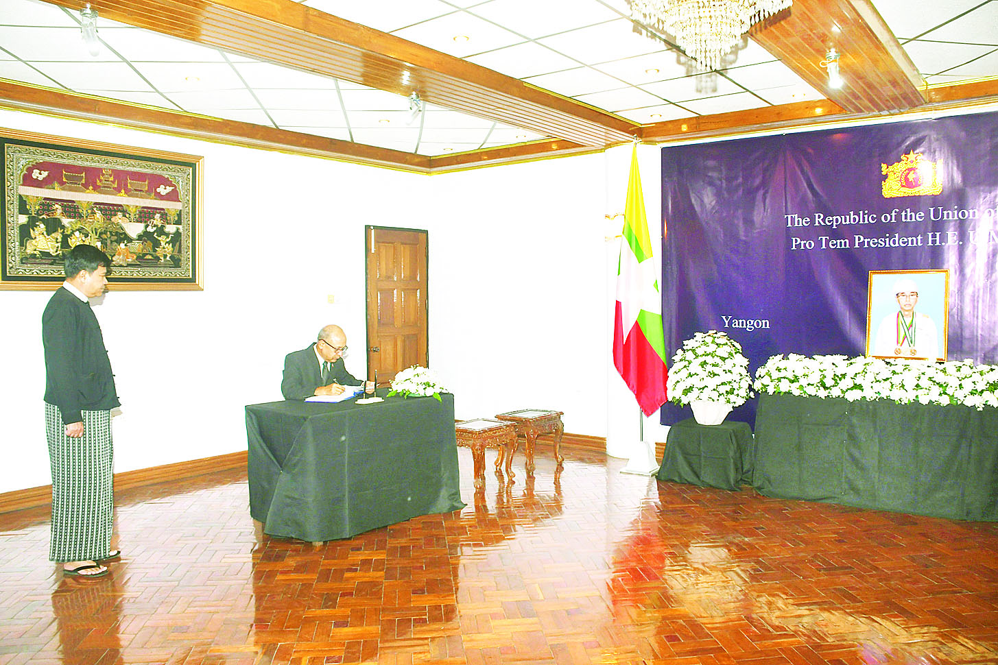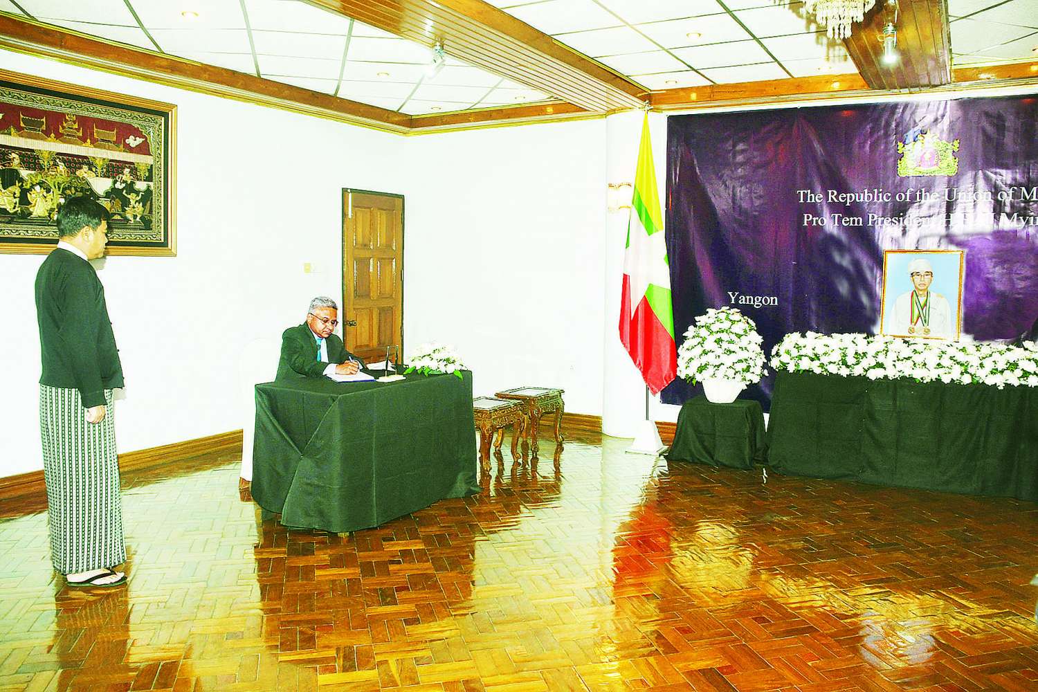 ပြည်ထောင်စုသမ္မတမြန်မာနိုင်ငံတော်၊ ယာယီသမ္မတ ဦးမြင့်ဆွေသည် ဩဂုတ် ၇ ရက်တွင်ကွယ်လွန်ခဲ့သည့်အတွက် ဝမ်းနည်းကြောင်းမှတ်တမ်းစာအုပ်ကို ရန်ကုန်မြို့၊ စကားဝါလမ်းရှိ နိုင်ငံခြားရေးဝန်ကြီးဌာန၌ ဩဂုတ် ၈ ရက်မှစတင်၍ ဖွင့်လှစ်ထားရာ မြန်မာနိုင်ငံဆိုင်ရာ သံအမတ်ကြီးများနှင့် သံရုံးအကြီးအကဲများက ဝမ်းနည်းကြောင်း လာရောက်လက်မှတ်ရေးထိုးခဲ့ကြသည်။