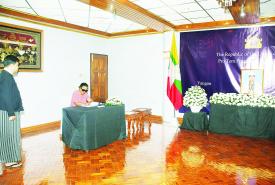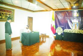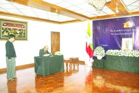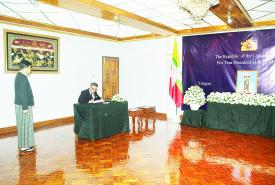 ယနေ့တွင် မြန်မာနိုင်ငံဆိုင်ရာ သံရုံးအကြီးအကဲများဖြစ်သည့် နီပေါသံအမတ်ကြီး H.E. Mr. Harishchandra Ghimire ၊ ထိုင်းသံအမတ်ကြီး H.E. Mr. Mogkol Visitstump၊ ဘင်္ဂလားဒေ့ရှ် သံအမတ်ကြီး Dr. Md. Monwar Hossain ၊ ဘရာဇီးသံအမတ်ကြီး H.E. Mr. Gustavo Rocha de Menezes ၊ အိန္ဒိယသံအမတ်ကြီး H.E. Mr. Abhay Thakur ၊ ယူအေအီးသံအမတ်ကြီး H.E. Mr. Mutaz Abdullah Abduljaleel Mohamed Al Faheem ၊ တရုတ်သံအမတ်ကြီး H.E. Ms. Ma Jia၊ ကမ္ဘောဒီးယား သံအမတ်ကြီး H.E. Mr. CHENG Manith ၊ လာအိုသံအမတ်ကြီး H.E. Mr. Bounphieng CHANTHAVONG နှင့် အစ္စရေးသံရုံးယာယီတာဝန်ခံ Mrs. Ruth Zakh ၊ တီမောလက်စ်တေ သံရုံးယာယီတာဝန်ခံ Mr. Olandino Rui de Andrade နှင့် ဟိုလီဆီးသံရုံး ယာယီတာဝန်ခံ၏ ကိုယ်စားလှယ် Fr. Hilary တို့က ဝမ်းနည်းကြောင်းမှတ်တမ်းစာအုပ်တွင် လာရောက်လက်မှတ်ရေးထိုးခဲ့ကြသည်။