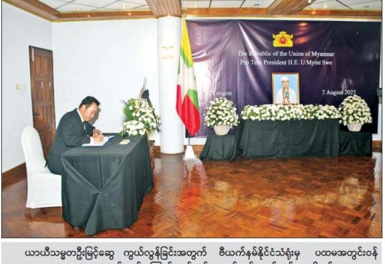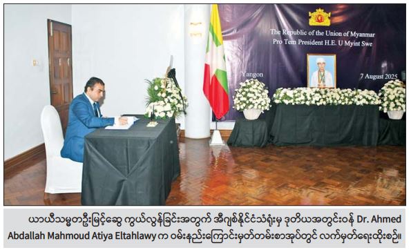ယနေ့တွင် မြန်မာနိုင်ငံဆိုင်ရာသံရုံးအကြီးအကဲများဖြစ်သည့် ဗီယက်နမ်နိုင်ငံသံရုံးမှ ပထမအတွင်းဝန် Mr. Nguyen Cong Son ၊ အီဂျစ်နိုင်ငံသံရုံးမှ ဒုတိယအတွင်းဝန် Dr. Ahmed Abdallah Mahmoud Atiya Eltahlawy နှင့် တောင်အာဖရိကနိုင်ငံ ဂုဏ်ထူးဆောင်ကောင်စစ်ဝန် ဦးမြင့်ဌေးတို့က ဝမ်းနည်းကြောင်းမှတ်တမ်းစာအုပ်တွင် လာရောက်လက်မှတ်ရေးထိုးခဲ့ကြသည်။