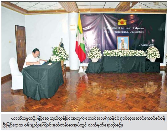 ပြည်ထောင်စုသမ္မတ မြန်မာနိုင်ငံတော်၊ ယာယီသမ္မတဦးမြင့်ဆွေသည် ဩဂုတ် ၇ ရက်တွင် ကွယ်လွန်ခဲ့သည့်အတွက် ဝမ်းနည်းကြောင်းမှတ်တမ်းစာအုပ်ကို ရန်ကုန်မြို့ စကားဝါလမ်းရှိ နိုင်ငံခြားရေးဝန်ကြီးဌာန၌ ဩဂုတ် ၈ ရက်မှစတင်၍ ဖွင့်လှစ်ထားရာ မြန်မာနိုင်ငံဆိုင်ရာ သံအမတ်ကြီးများနှင့် သံရုံးအကြီးအကဲများက ဝမ်းနည်းကြောင်း လာရောက်လက်မှတ် ရေးထိုးခဲ့ကြသည်။