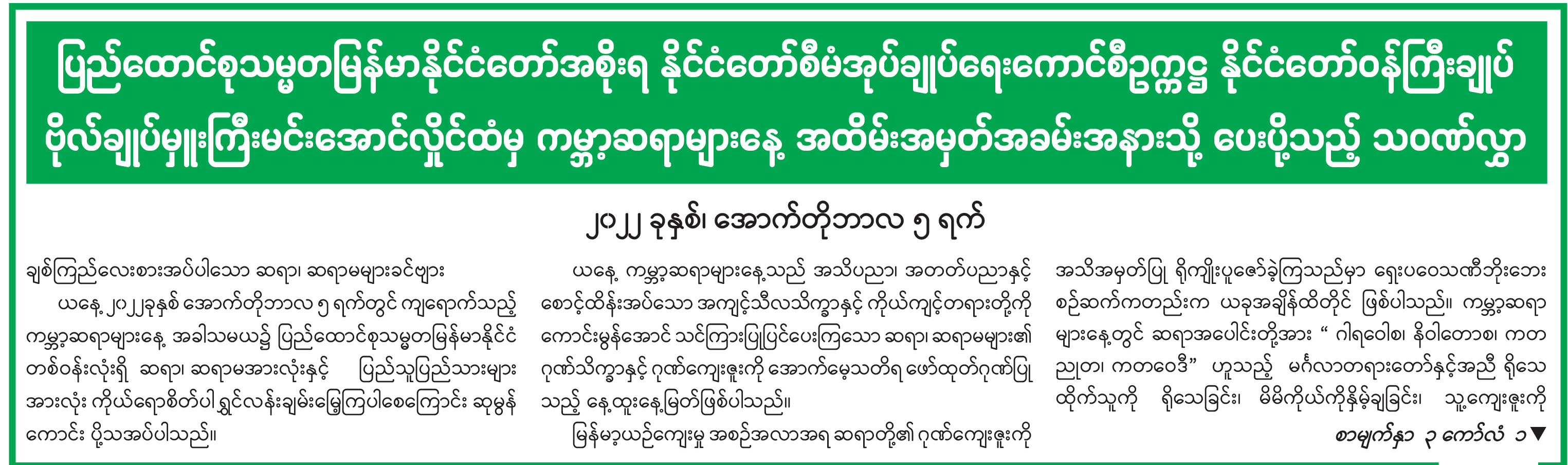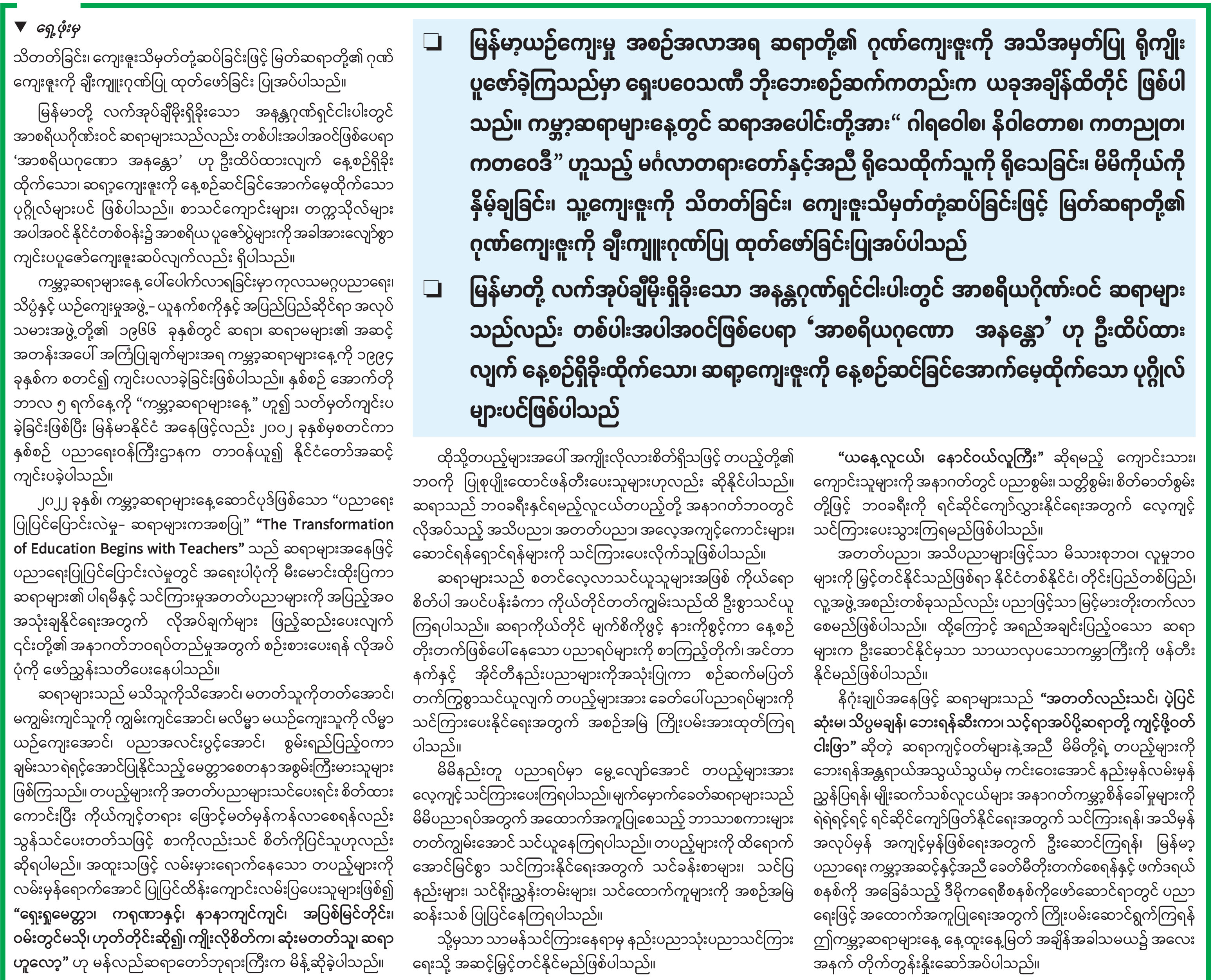 ပြည်ထောင်စုသမ္မတမြန်မာနိုင်ငံတော်အစိုးရ နိုင်ငံတော်စီမံအုပ်ချုပ်ရေးကောင်စီဥက္ကဋ္ဌ နိုင်ငံတော်ဝန်ကြီးချုပ် ဗိုလ်ချုပ်မှူးကြီးမင်းအောင်လှိုင်ထံမှ ကမ္ဘာ့ဆရာများနေ့ အထိမ်းအမှတ်အခမ်းအနားသို့ ပေးပို့သည့် သဝဏ်လွှာ