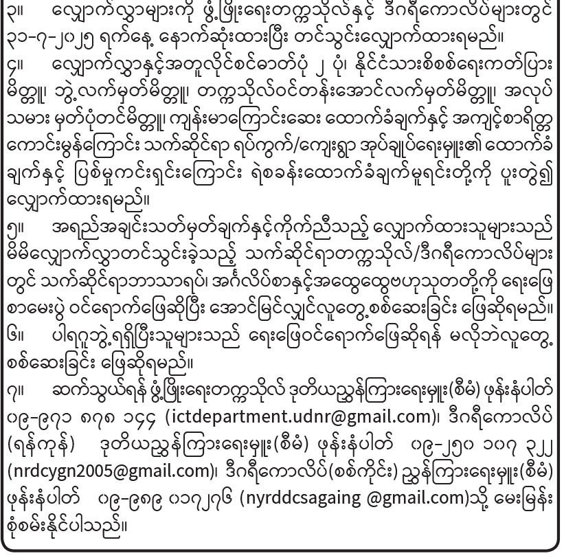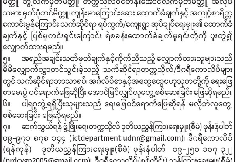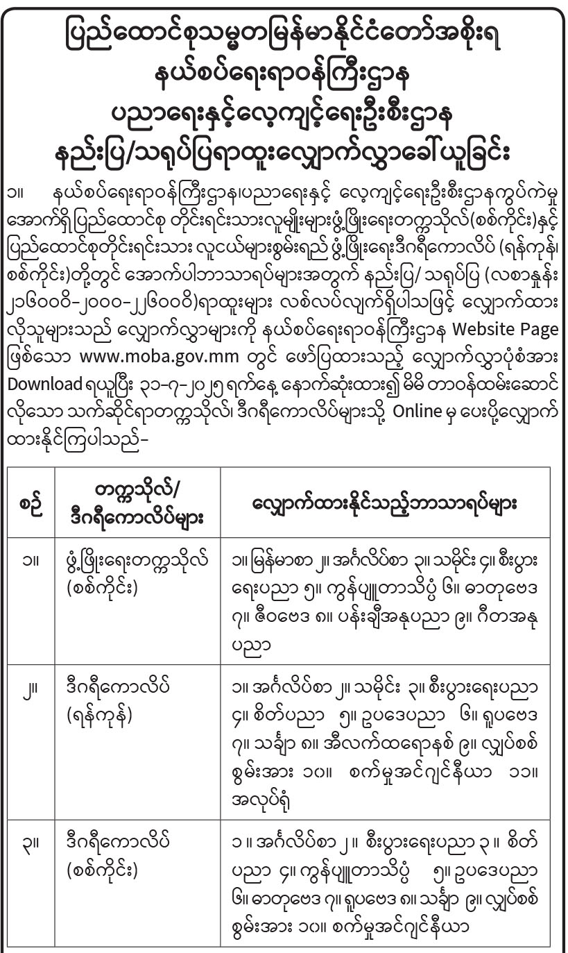 ပြည်ထောင်စုသမ္မတမြန်မာနိုင်ငံတော်အစိုးရ နယ်စပ်ရေးရာဝန်ကြီးဌာန ပညာရေးနှင့်လေ့ကျင့်ရေးဦးစီးဌာန နည်းပြ/သရုပ်ပြရာထူးလျှောက်လွှာခေါ်ယူခြင်း