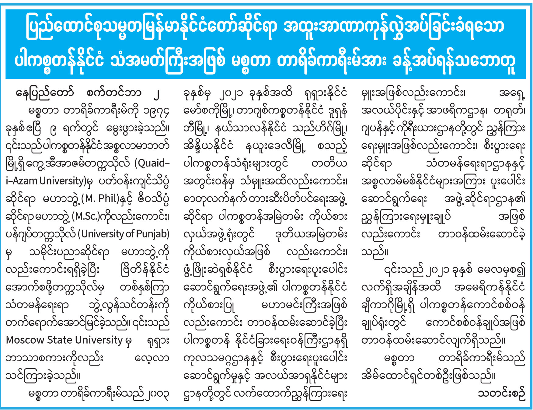 ပြည်ထောင်စုသမ္မတမြန်မာနိုင်ငံတော်ဆိုင်ရာ အထူးအာဏာကုန်လွှဲအပ်ခြင်းခံရသော ပါကစ္စတန်နိုင်ငံ သံအမတ်ကြီးအဖြစ် မစ္စတာ တာရိခ်ကာရီးမ်အား ခန့်အပ်ရန်သဘောတူ