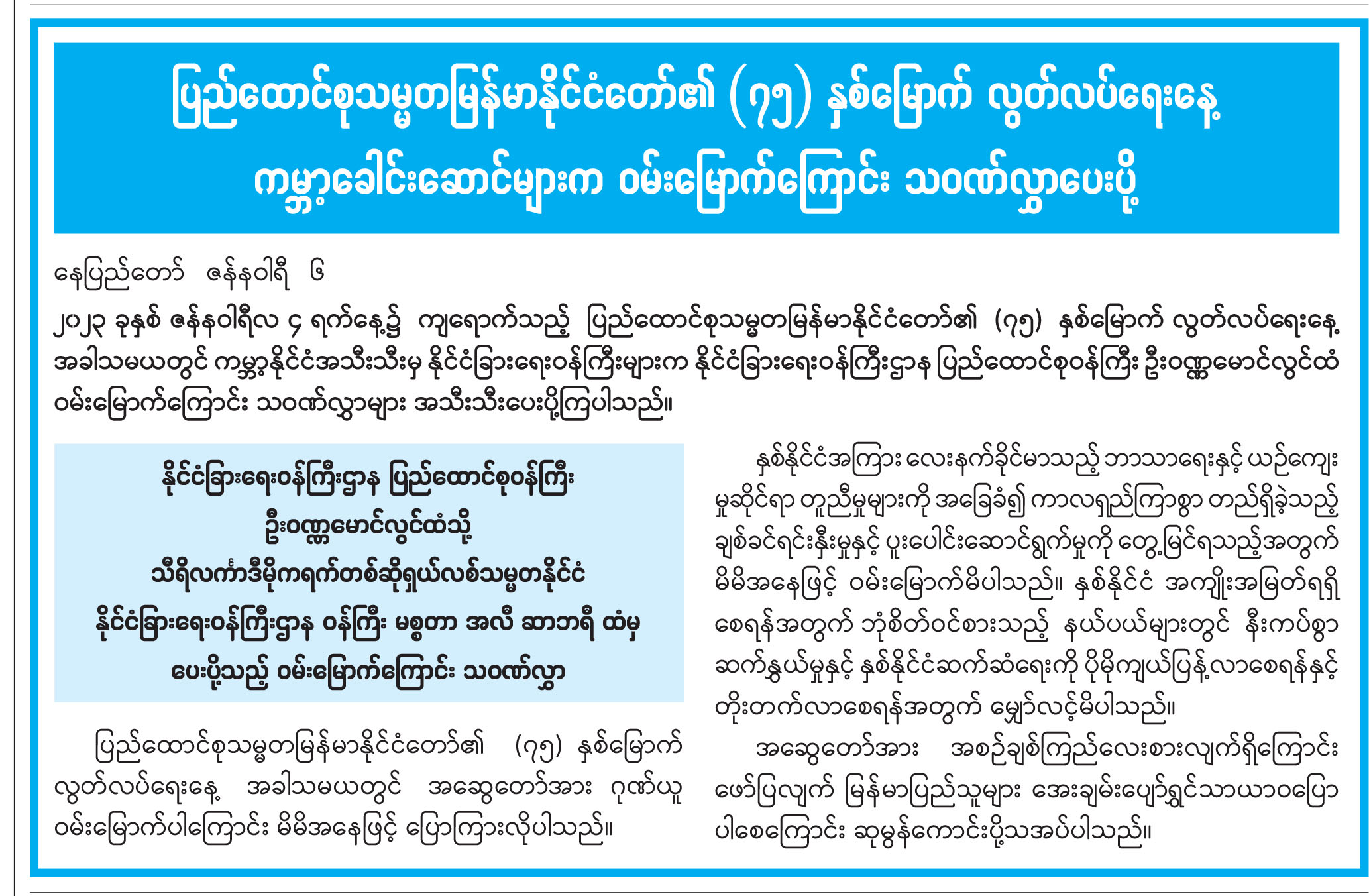 ပြည်ထောင်စုသမ္မတမြန်မာနိုင်ငံတော်၏ (၇၅) နှစ်မြောက် လွတ်လပ်ရေးနေ့ ကမ္ဘာ့ခေါင်းဆောင်များက ဝမ်းမြောက်ကြောင်း သဝဏ်လွှာပေးပို့