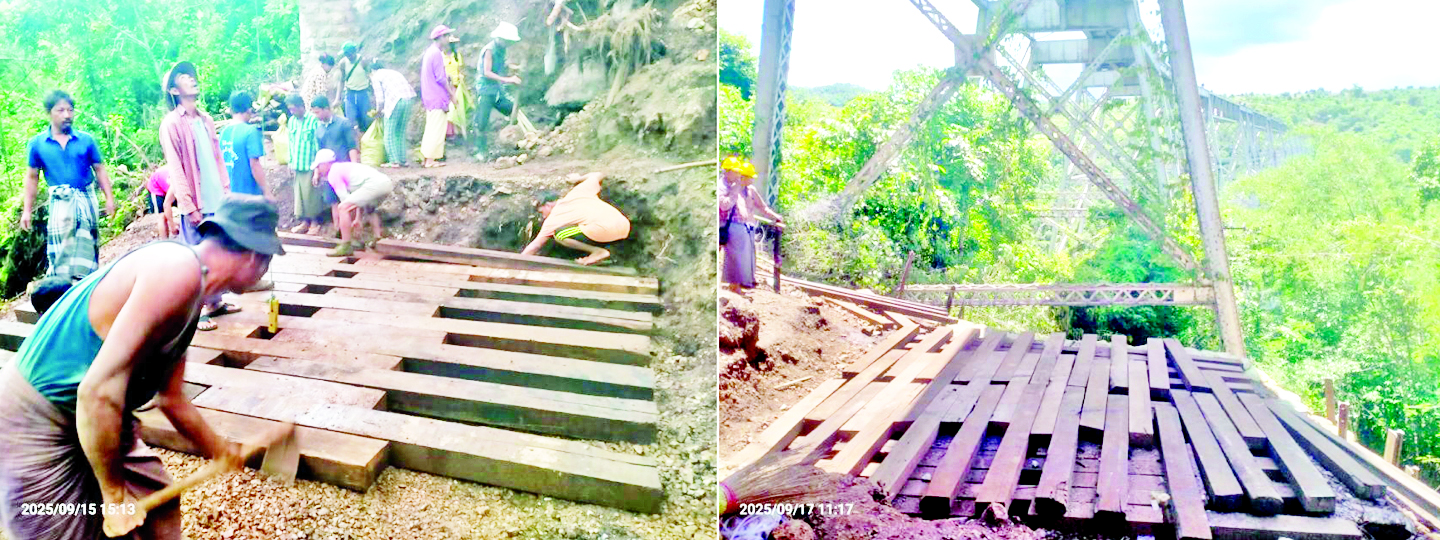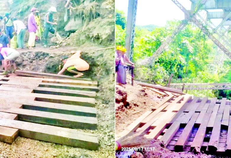 ထို့နောက် ပို့ဆောင်ရေးနှင့် ဆက်သွယ်ရေးဝန်ကြီးဌာန ပြည်ထောင်စု ဝန်ကြီးနှင့် တာဝန်ရှိသူများက မန္တလေး-လားရှိုး ရထားလမ်းပိုင်းရှိ ပြင်ဦးလွင် - နောင်ချို-ဂုတ်ထိပ်-ကျောက်မဲ ရထားလမ်းပိုင်းအား ပြန်လည်ပြေးဆွဲနိုင်ရေးအတွက် အကြမ်းဖက် သောင်းကျန်းသူများ၏ မိုင်းထောင်ဖောက်ခွဲခဲ့မှု ကြောင့် ပျက်စီးခဲ့သည့် ဂုတ်ထိပ်-နောင်ပိန်ကြား ဂုတ်ထိပ်တံတား တိုင်အမှတ်(၁၆)နှင့် ကမ်းကပ်ခုံ အမှတ်(၂) အကြား ထိခိုက်ပျက်စီးမှုအား ရှေးမူလပုံစံပါအတိုင်း သံပေါင်အသစ် အစားထိုး ပြင်ဆင် ဆောင်ရွက်လျက်ရှိမှု၊ ပျက်စီးခဲ့သည့် သံပေါင်အဟောင်းအား ဖယ်ရှားရှင်းလင်း၍ ယာယီအဖြစ် Way Beam သံပေါင်များ ထည့်သွင်းပြီး သံလမ်းခင်းခြင်း လုပ်ငန်းများ ဆောင်ရွက်လျက်ရှိမှုနှင့် ပျက်စီးခဲ့သည့် သံပေါင်နှင့် ပုံစံတူသံပေါင်သစ်အား ပြန်လည် ထုတ်လုပ်လျက်ရှိမှု၊ လမ်းပိုင်း တစ်လျှောက် တောချုံခုတ်ခြင်းနှင့် လမ်းပိုင်းများ ပြုပြင်ခြင်း၊ ထုံးဖို-ပြင်ဦးလွင် - နောင်ချို - ဂုတ်ထိပ်-ကျောက်မဲရထားလမ်းပိုင်း ပြုပြင် ထိန်းသိမ်း ဆောင်ရွက်ခြင်းနှင့် ရထားလမ်းတစ်လျှောက် အကြမ်းဖက်သောင်းကျန်းသူများ ထောင်ထားသည့် မိုင်းများရှင်းလင်းခဲ့မှု အခြေအနေများ၊ ရထားသံလမ်း အစိတ်အပိုင်းများနှင့် ဆက်စပ်ပစ္စည်းများအား သောင်းကျန်းသူများက ဖျက်ဆီး ခဲ့မှုများ၊ သံလမ်းဆက်ပြား ၃၈၃၂ ပြား၊ မူလီ ၁၇၁၈၈ လုံး၊ သံလမ်း ထိန်းကလစ် ၁၆၃၁၁၅ ချောင်းတို့ အား အကြမ်းဖက်သောင်းကျန်း သူများက ခိုးယူသွားမှုနှင့် အချိန်မီ အစားထိုး တပ်ဆင်နိုင်ရေး ဆောင်ရွက်လျက်ရှိမှု အခြေအနေများနှင့် ရထားလမ်းပြန်လည် ဖွင့်လှစ်နိုင်ရေး ဆောင်ရွက်လျက် ရှိမှုအခြေအနေများနှင့် ပတ်သက်၍ ရှင်းလင်းတင်ပြသည်။