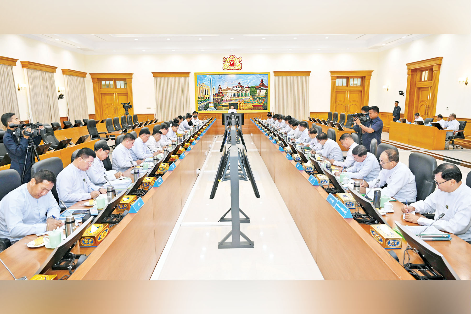 ပြည်ထောင်စုသမ္မတမြန်မာနိုင်ငံတော်ယာယီသမ္မတ နိုင်ငံတော်လုံခြုံရေးနှင့်အေးချမ်းသာယာရေးကော်မရှင်ဥက္ကဋ္ဌ ဗိုလ်ချုပ်မှူးကြီး မင်းအောင်လှိုင်နှင့် ပြည်ထောင်စုဝန်ကြီးများ၊ နေပြည်တော်ကောင်စီဥက္ကဋ္ဌ၊ တိုင်းဒေသကြီး/ ပြည်နယ်ဝန်ကြီးချုပ်များ လုပ်ငန်းညှိနှိုင်းအစည်းအဝေးကို ယနေ့မွန်းလွဲပိုင်းတွင် နေပြည်တော်၌ ကျင်းပပြုလုပ်သည်။