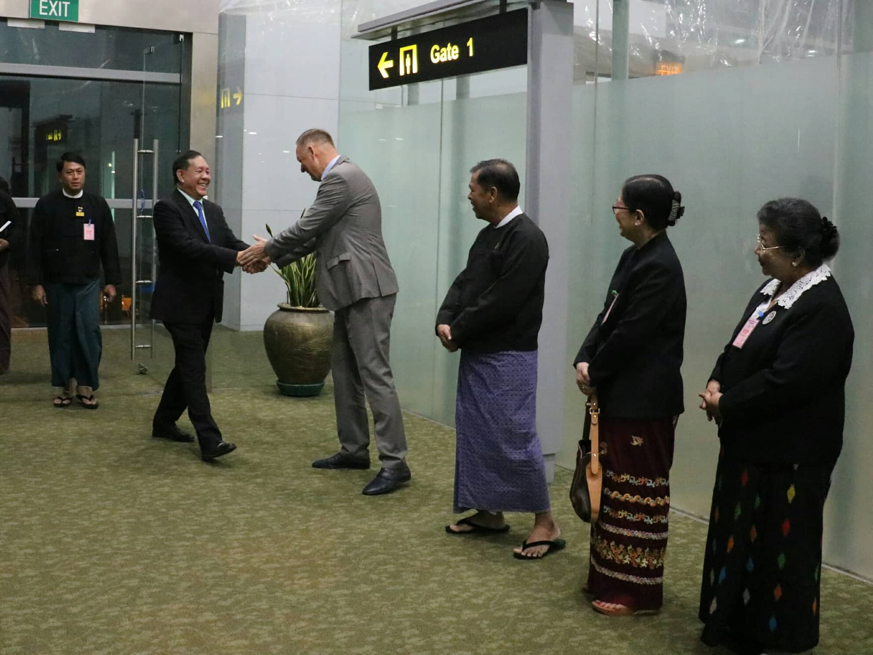 ပြည်ထောင်စု တရားသူကြီးချုပ်အား မြန်မာနိုင်ငံဆိုင်ရာ ရုရှားဖက်ဒရေးရှင်း နိုင်ငံသံအမတ်ကြီး H.E. Mr. Nikolay Alistopadov နှင့်သံရုံးမှတာဝန်ရှိသူများ၊ ရန်ကုန်တိုင်းဒေသကြီး တရားလွှတ်တော် တရားသူကြီးချုပ်နှင့် တရားလွှတ်တော် တရားသူကြီးများ၊ ရန်ကုန်တိုင်းဒေသကြီး တရားရေးဦးစီးမှူးနှင့် တာဝန်ရှိသူများက ရန်ကုန်အပြည်ပြည်ဆိုင်ရာလေဆိပ်၌ ကြိုဆိုနှုတ်ဆက်ခဲ့ကြသည်။