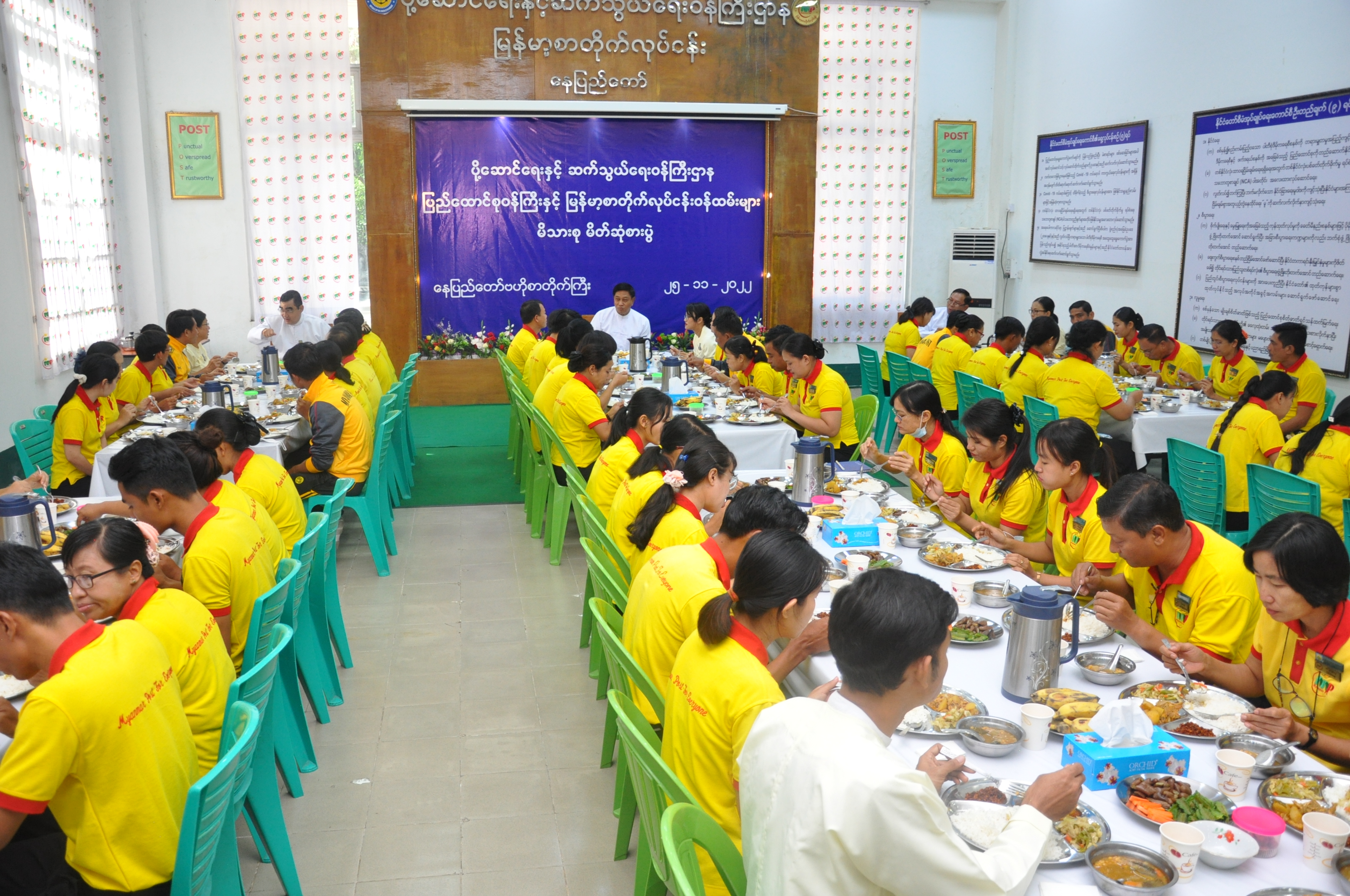 ပို့ဆောင်ရေးနှင့် ဆက်သွယ်ရေးဝန်ကြီးဌာန၊ ပြည်ထောင်စုဝန်ကြီး ဗိုလ်ချုပ်ကြီး တင်အောင်စန်းသည် ယနေ့တွင် နိုင်ငံတော်၏ အုပ်ချုပ်ရေးယန္တရား ကောင်းမွန်စွာလည်ပတ်နိုင်ရေးအတွက် ကျရာကဏ္ဍမှ သစ္စာရှိစွာဖြင့် တာဝန်ကျေပွန်စွာ ထမ်းဆောင်နေကြသည့် မြန်မာ့စာတိုက်လုပ်ငန်း၊ ရုံးချုပ်နှင့် နေပြည်တော် စာတိုက်ကြီးရှိ အရာထမ်း၊ အမှုထမ်းများကို အသိအမှတ် ပြုသောအားဖြင့် မိသားစုမိတ်ဆုံ နေ့လယ်စာစားပွဲကို ပြုလုပ်ခဲ့ပြီး ဝန်ကြီးဌာန အားကစားပြိုင်ပွဲများ၌ ပိုက်ကျော်ခြင်းပြိုင်ပွဲနှင့် စားပွဲတင် တင်းနစ်ပြိုင်ပွဲ တစ်ဦးချင်းနှင့် နှစ်ယောက်တွဲ ပြိုင်ပွဲများတွင် ဆုရရှိခဲ့ကြသော မြန်မာ့စာတိုက်လုပ်ငန်း ဝန်ထမ်းများကို ဂုဏ်ပြုမှတ်တမ်းလွှာများ ပေးအပ်သည်။