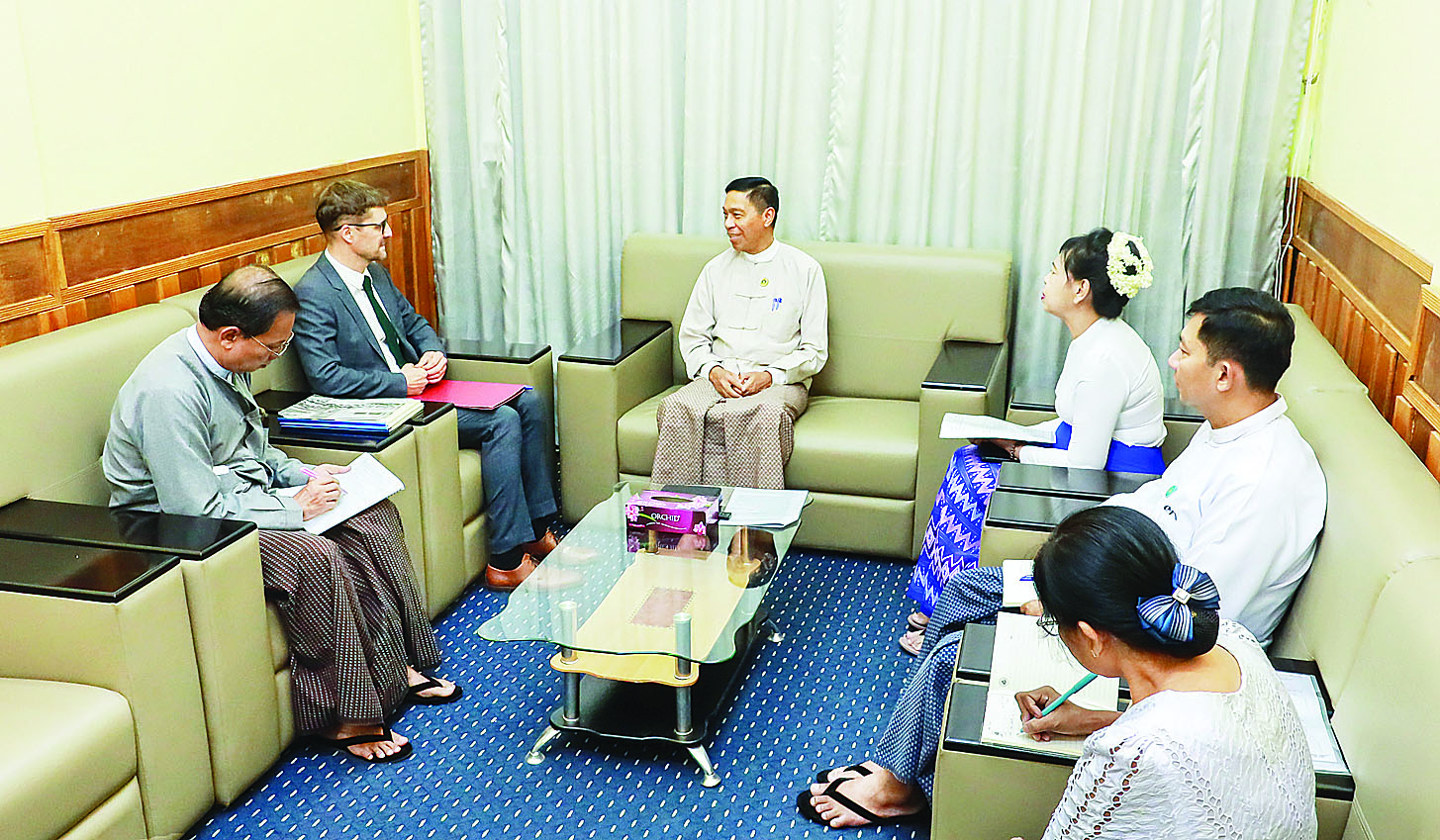 တွေ့ဆုံစဉ် ပြည်ထောင်စုဝန်ကြီးက မန္တလေးငလျင်ကြီး လှုပ်ခတ်မှုကြောင့် ထိခိုက်ဆုံးရှုံးမှုများအား ပြည်လည်ထူထောင်ရေးအတွက် နိုင်ငံတော်အစိုးရက ဆောင်ရွက်နေမှု အခြေအနေများ၊ ဆောက်လုပ်ရေးလုပ်ငန်းသုံးပစ္စည်းများ လိုအပ်နေမှုနှင့် နိုင်ငံတကာ အဖွဲ့အစည်းများ၏ ပူးပေါင်း ဆောင်ရွက်မှုများကို ကြိုဆိုကြောင်းဆွေးနွေးပြီး ICRC ဘက်မှ ငလျင်ဘေးသင့်ဒေသများအတွက် ရေရရှိရေး၊ ကျန်းမာရေးနှင့် ဆေးဘက်ဆိုင်ရာ အထောက်အပံ့ပေးနေမှု လုပ်ငန်းများနှင့် ICRC ၏ ပုံမှန်ဆောင်ရွက်နေသောလုပ်ငန်းများကို ရှင်းလင်းတင်ပြသည်။ ထို့နောက် ဝန်ကြီးဌာနနှင့် ICRC တို့အကြား ပူးပေါင်းဆောင်ရွက်လျက်ရှိသော လုပ်ငန်းများနှင့် ဆက်လက်ပူးပေါင်း ဆောင်ရွက်မည့် ကိစ္စများကို အမြင်ချင်းဖလှယ် ဆွေးနွေးကြသည်။