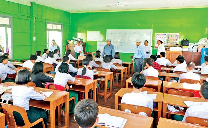 ကြည့်ရှုစစ်ဆေးစဉ် ကလောမြို့ သန့်ရှင်းသာယာလှပရေး၊ ရေကြီးရေလျှံမှုမဖြစ်ပေါ်စေရေး ဆောင်ရွက်ရန်နှင့် မြို့နေပြည်သူလူထုပူးပေါင်းပါဝင်ရေး စည်းရုံးဆောင်ရွက်ကြရန် မှာကြားပြီး အောင်ပန်းမြို့ အမက(၈)တွင် AHA Center ၏ ပေါင်းစပ်ညှိနှိုင်းမှုဖြင့် အာဆီယံကလှူဒါန်းထားသော Prefabricated ကျောင်းဆောင် ဆောက်လုပ်ပြီးစီးမှုနှင့် ကျောင်းသား ကျောင်းသူများ အေးချမ်းပျော်ရွှင်စွာ ပညာသင်ကြားနေမှုကို ကြည့်ရှုအားပေးသည်။