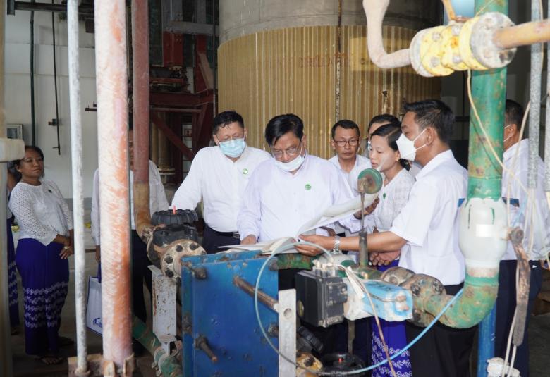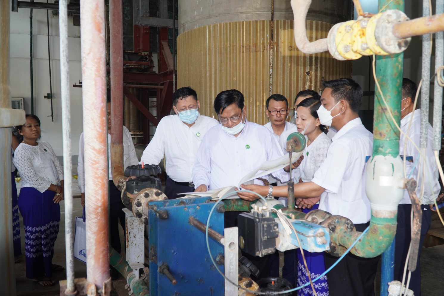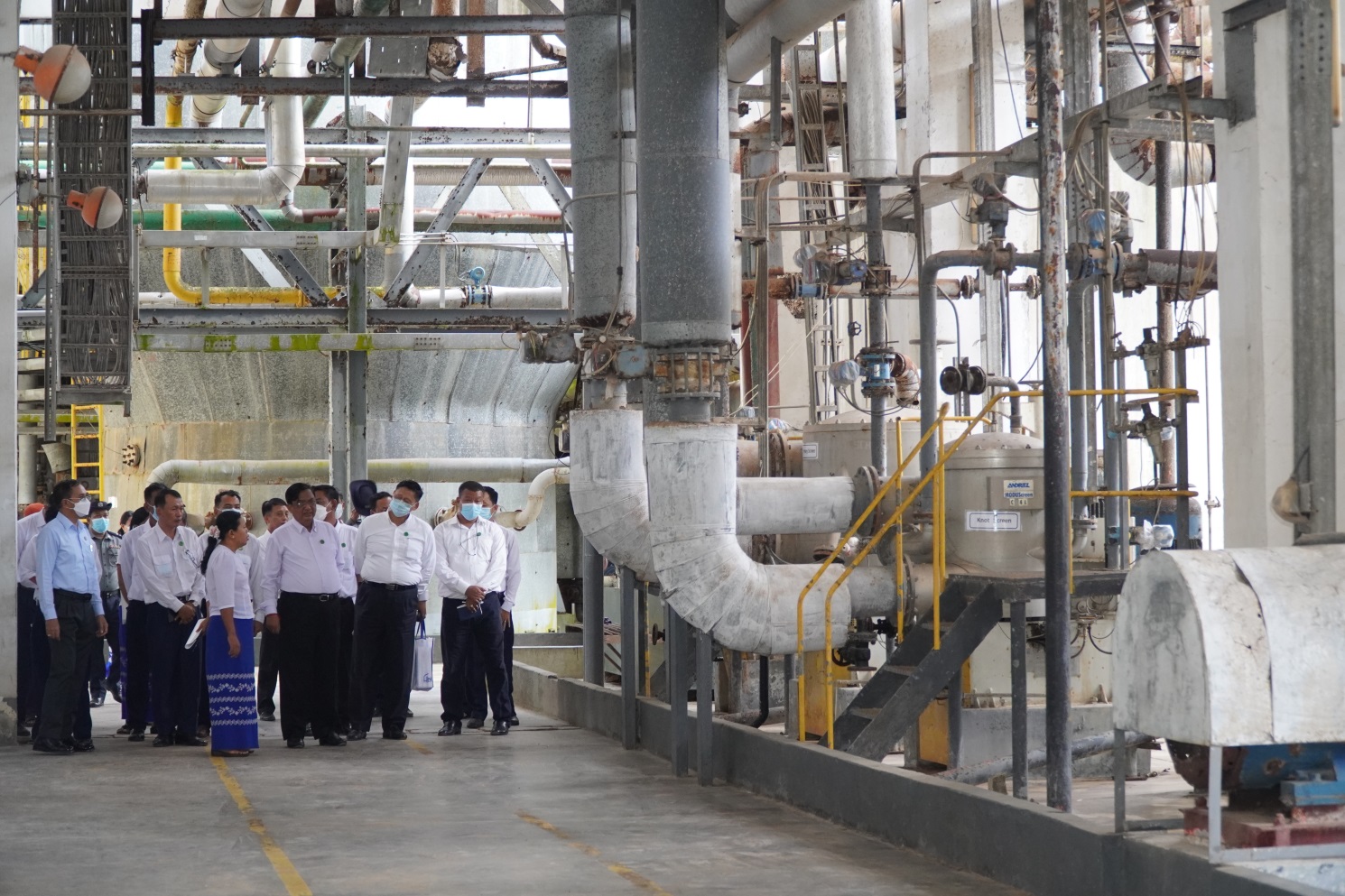 တွေ့ဆုံစဉ် အမှတ်(၃)အကြီးစား စက်မှုလုပ်ငန်း၊ ဦးဆောင်ညွှန်ကြားရေးမှူးက စက်ရုံ သမိုင်းအကျဉ်း၊ စက်ရုံဆိုင်ရာ အချက်အလက်များနှင့် ဘဏ္ဍာရေးဆိုင်ရာများကို ရှင်းလင်းတင်ပြရာ ပြည်ထောင်စုဝန်ကြီးက စက်မှုလုပ်ငန်းများသည် စီးပွားရေးကဏ္ဍနှင့် ဒွန်တွဲ၍ ဆောင်ရွက်ရခြင်းဖြစ်သဖြင့် စနစ်တကျ စီမံဆောင်ရွက်ရမည်ဖြစ်ကြောင်း၊ ဝန်ထမ်း တစ်ဦးချင်းနှင့် အလုပ်ရုံ/ စက်ရုံအလိုက် စွမ်းဆောင်ရည်များ မြင့်မားတိုးတက်စေရန် အစီအမံများ ချမှတ်ဆောင်ရွက်ရမည်ဖြစ်ကြောင်း၊ စက်ရုံခွဲများ၌ တပ်ဆင်ထားသည့် စက်ပစ္စည်း ကိရိယာများ ပျက်စီးဆုံးရှုံးမှုမရှိစေရန် ပြုပြင်ထိန်းသိမ်းရေး လုပ်ငန်းများကို စဉ်ဆက်မပြတ်ဆောင် ရွက်ရမည်ဖြစ်ကြောင်း မှာကြားပြီး ပျော့ဖတ်ချပ်အိုးဌာန၊ ပျော့ဖတ်ချပ်ဌာန၊ Dryer Section၊ တန် (၅၀) အဆင့်မြင့် စက္ကူထုတ်စက်ရုံ၊ ကလိုရင်းဒိုင်အောက်ဆိုဒ် ထုတ်လုပ်ရေးဌာန၊ ကလိုရင်းအယ်လ်ကာလီ ထုတ်လုပ်ရေးဌာန၊ ဓာတ်ဆားပြန်ထုတ်ဌာနနှင့် ရေဆိုးသန့်စင်ရေး ဌာနတို့ကို ကြည့်ရှုစစ်ဆေးသည်။