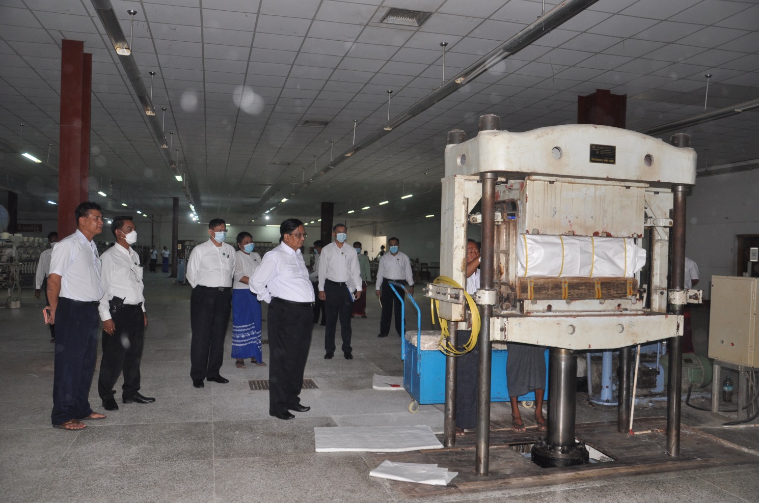 ထို့နောက် ပြည်ထောင်စုဝန်ကြီးနှင့် ဒုတိယဝန်ကြီးတို့သည် အမှတ် (၈) အထည်စက်ရုံ (ပျော်ဘွယ်) သို့ ရောက်ရှိပြီး အစည်းအဝေးခန်းမ၌ စက်ရုံမှူးနှင့် တာဝန်ရှိသူတို့က လုပ်ငန်းအကောင်အထည်ဖော် ဆောင်ရွက်နေမှုတို့ကို ရှင်းလင်းတင်ပြရာ ပြည်ထောင်စုဝန်ကြီးက စက်ရုံများအနေဖြင့် စက်မှုလုပ်ငန်းနှင့် စီးပွားရေးလုပ်ငန်းကို ပေါင်းစပ်ဆောင်ရွက်နေရခြင်း ဖြစ်၍ စနစ်တကျလေ့လာပြီး ပေါင်းစပ်ညှိနှိုင်းဆောင်ရွက်ရန်၊ တစ်ယူနစ် ထုတ်လုပ်မှုကုန်ကျစရိတ် လျော့နည်းသက်သာရေးနှင့် အရည်အသွေးမီ ထုတ်ကုန်များ တိုးတက်ထုတ်လုပ်နိုင်ရေး စီမံဆောင်ရွက်ရန်၊ စက်ရုံများအနေဖြင့် လုပ်ငန်းလည်ပတ် အကောင်အထည်ဖော်ရာတွင် Business Plan များ ရေးဆွဲဆောင်ရွက်ရန်၊ နိုင်ငံအတွင်း၌ ကုန်ထုတ်လုပ်မှုလုပ်ငန်းများ ဖွံ့ဖြိုးတိုးတက်လျှင် သွင်းကုန်အစားထိုးနိုင်ပြီး နိုင်ငံခြားငွေသုံးစွဲရမှု သက်သာသဖြင့် အောင်မြင်အောင် ကြိုးစားဆောင်ရွက်ရန်၊ စက်ရုံရေရှည်ရပ်တည် လည်ပတ်နိုင်ရေးအတွက် ဝန်ထမ်းအားလုံးက ဝိုင်းဝန်းပူးပေါင်း ဆောင်ရွက်ကြရန် မှာကြားပြီး ချည်များထုတ်လုပ်နေမှု လုပ်ငန်းစဉ်အဆင့်ဆင့်နှင့် ချည်မျှင်ဓာတ်ခွဲခန်းတို့ကို ကြည့်ရှုစစ်ဆေးခဲ့ကြောင်း သိရသည်။