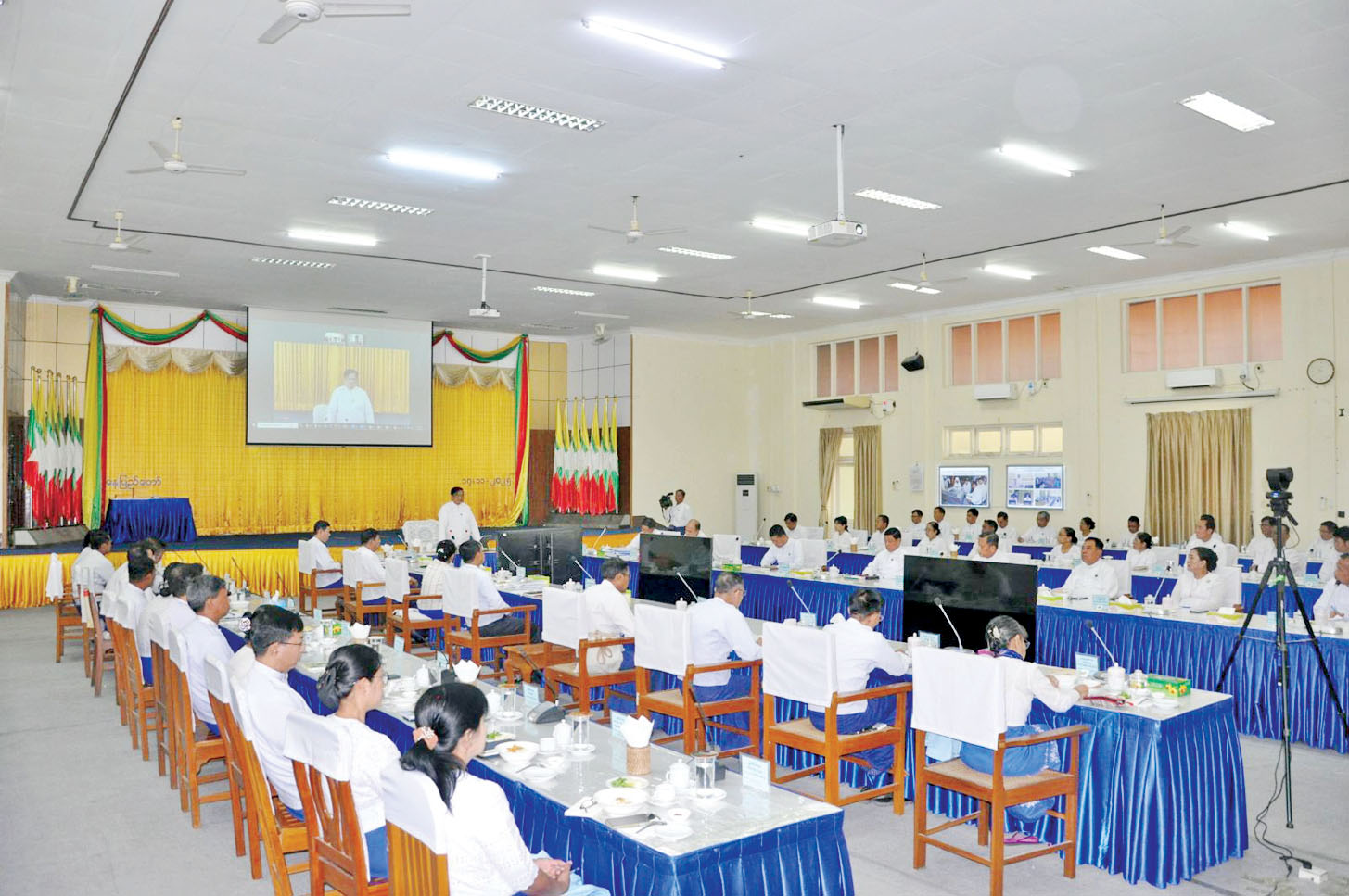 ဦးစွာ ပြည်ထောင်စုဝန်ကြီးက အမျိုးသားကာကွယ်ရေးနှင့် လုံခြုံရေးကောင်စီလက်ထက်တွင် နိုင်ငံတော်ကချီးမြှင့်အပ်နှင်းသည့် စွမ်းဆောင်မှုဆိုင်ရာ ဂုဏ်ထူးဆောင်ဘွဲ့များ၊ ဂုဏ်ထူးဆောင်တံဆိပ်များနှင့် စပ်လျဉ်း၍ စက်မှုဝန်ကြီးဌာနမှ ဝန်ထမ်း ၃၆ ဦး ရရှိခဲ့ကြောင်း၊ ယခုနှစ်တွင် စီမံထူးချွန်တံဆိပ်(တတိယအဆင့်) ၁၂ ဦး၊ စက်မှုစီးပွား ထူးချွန် တံဆိပ်(တတိယအဆင့်)ငါးဦး၊ ဝန်ဆောင်စီးပွား ထူးချွန်တံဆိပ်(တတိယအဆင့်)တစ်ဦး စုစုပေါင်း ဝန်ထမ်း ၁၈ ဦးရရှိခဲ့ကြောင်း၊ ရရှိခဲ့သည့် ဝန်ထမ်းများသည် သက်ဆိုင်ရာ လုပ်ငန်းနယ်ပယ်အသီးသီးတွင် ထူးကဲစွာစွမ်းဆောင်ခဲ့သူများ၊ မန္တလေးငလျင်ကြီးကြောင့် ထိခိုက်ပျက်စီး ဆုံးရှုံးခဲ့မှုများနှင့်စပ်လျဉ်း၍ ပြန်လည်ထူထောင်ရေး လုပ်ငန်းစဉ်များတွင် စွမ်းစွမ်းတမံဆောင်ရွက်ခဲ့သူများ၊ လျှပ်စစ်သုံးယာဉ်နှင့် ဆက်စပ်လုပ်ငန်းများ ဖွံ့ဖြိုးတိုးတက်ရေးဆိုင်ရာ ကိစ္စရပ်များတွင် ပါဝင်ဆောင်ရွက်ခဲ့သူများ၊ သံမဏိစက်ရုံစီမံကိန်းများတွင် ပါဝင်ဆောင်ရွက်ခဲ့သူများ ဖြစ်ကြောင်း၊ ဦးစီးဌာန/လုပ်ငန်းများအနေဖြင့် ဝန်ထမ်းများအား ဂုဏ်ထူးဆောင်တံဆိပ်များ ထပ်မံချီးမြှင့်နိုင်ရေးအတွက် သေချာစွာစိစစ်ပြီး တင်ပြပေးကြရန်နှင့် မိမိတို့ဝန်ကြီးဌာနနှင့် ဆပ်စပ်လုပ်ကိုင်လျက်ရှိသည့် ပြင်ပအဖွဲ့အစည်းများမှ ပညာရှင်များ၊ ငလျင်ကာလတွင် လာရောက်ကူညီဆောင်ရွက်ပေးခဲ့သည့် ပညာရှင်များကိုလည်း ထောက်ခံတင်ပြပေးကြရန် ပြောကြားသည်။
