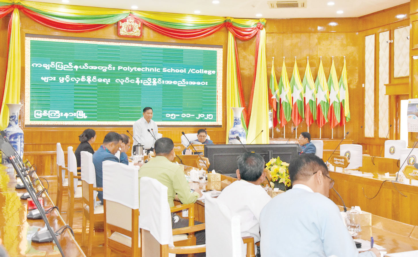 ပြည်ထောင်စုဝန်ကြီးသည် ယနေ့မွန်းလွဲပိုင်းတွင် မြစ်ကြီးနားမြို့၌ Polytechnic ကျောင်းဖွင့်လှစ်ရေးနှင့် စပ်လျဉ်း၍ ကချင်ပြည်နယ် အစိုးရအဖွဲ့ရုံးရှိ မလိခခန်းမတွင် ပြည်နယ်ဝန်ကြီးချုပ်၊ ပြည်နယ်ဝန်ကြီးများ၊ မြစ်ကြီးနားမြို့ရှိ တက္ကသိုလ်၊ ကျောင်းများမှ တာဝန်ရှိသူများ၊ သိပ္ပံနှင့်နည်းပညာဝန်ကြီး ဌာနအောက်ရှိ တက္ကသိုလ်၊ ကျောင်းများမှကျောင်းအုပ်ကြီးများနှင့် တွေ့ဆုံဆွေးနွေးကာ မြစ်ကြီးနားမြို့အတွက် ဒေသဖွံ့ဖြိုးရေးကို အထောက်အကူပြုမည့် လုပ်ငန်းခွင်နှင့် ချိတ်ဆက်ဆောင်ရွက်နိုင်မည့် တက္ကသိုလ်ဝင်တန်းမအောင်မြင်သူများ တက်ရောက်နိုင်သည့် Level 4 သင်တန်းများ ဖွင့်လှစ်နိုင်ရေးအတွက် ညှိနှိုင်းပေါင်းစပ်ဆွေးနွေးဆောင်ရွက်ခဲ့ကြောင်း သိရသည်။
