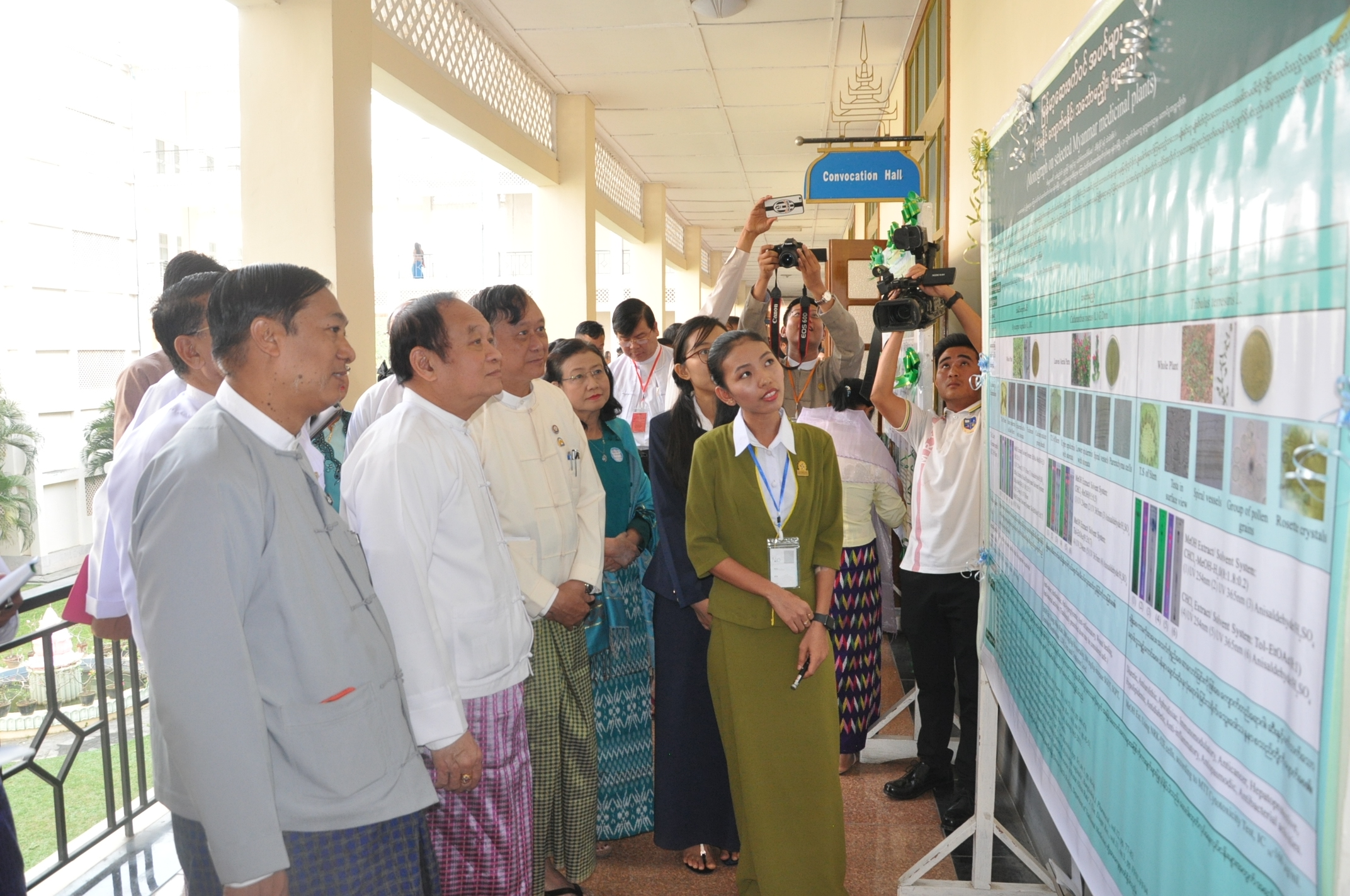 ယင်းနောက် ပြည်ထောင်စုဝန်ကြီးသည် ခင်းကျင်းပြသထားသော တိုင်းရင်းဆေး သုတေသနပိုစတာများကို လှည့်လည်ကြည့်ရှုသည်။