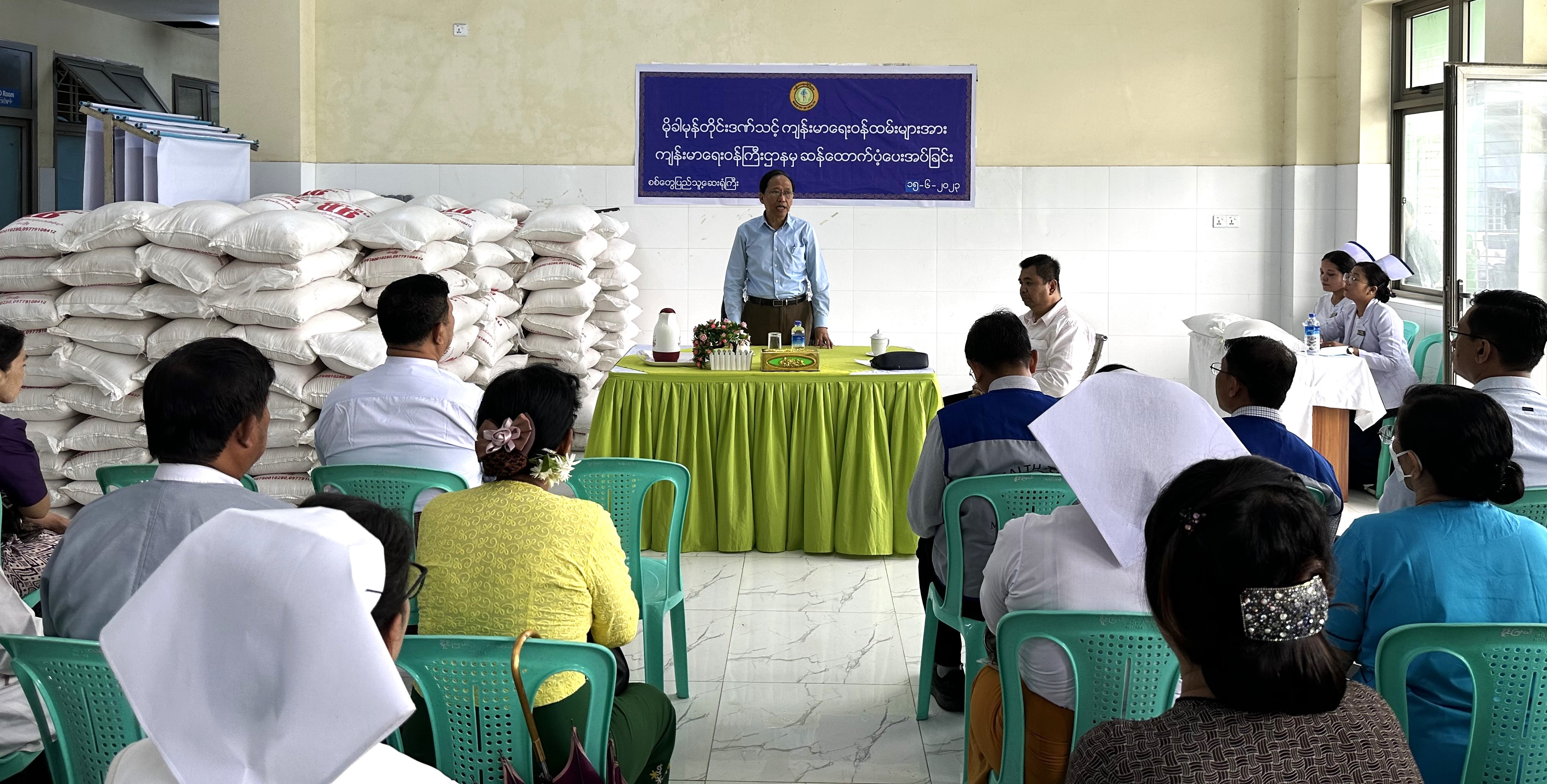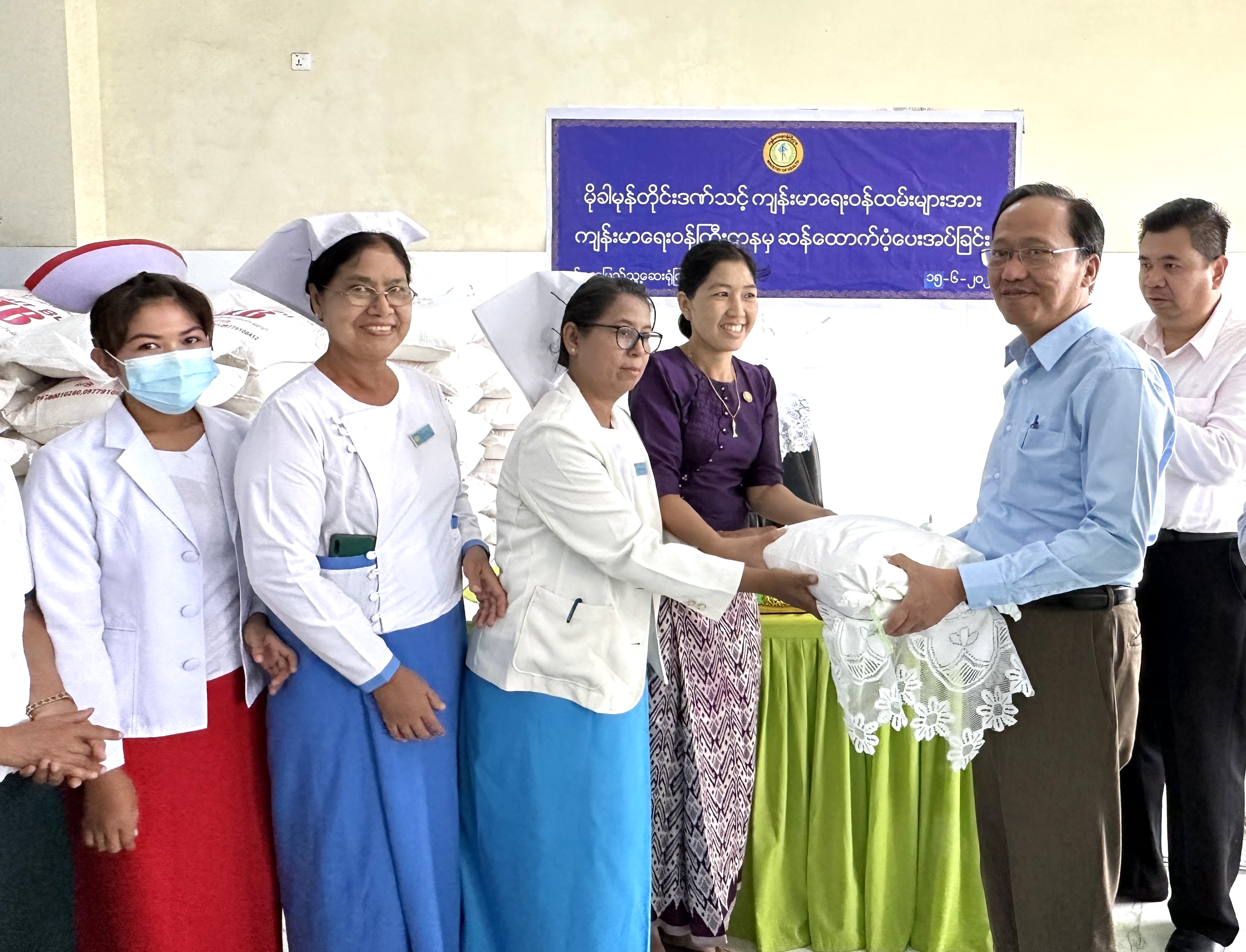 ကျန်းမာရေးဝန်ကြီးဌာန ပြည်ထောင်စုဝန်ကြီး ပါမောက္ခဒေါက်တာသက်ခိုင်ဝင်း သည် ကျန်းမာရေးလူ့စွမ်းအားအရင်းမြစ်ဦးစီးဌာန ညွှန်ကြားရေးမှူးချုပ် ဒေါက်တာတင်ထွန်း၊ တာဝန် ရှိသူများနှင့်အတူ ယနေ့နံနက်ပိုင်းတွင် စစ်တွေမြို့ ပြည်သူ့ဆေးရုံကြီး၍ ကျင်းပပြုလုပ်သည့် မိုခါမုန်တိုင်းဒဏ်သင့် ကျန်းမာရေးဝန်ထမ်းများအား ဆန်များထောက်ပံ့ပေးအပ်ခြင်း အခမ်းအနားသို့ တက်ရောက်သည်။