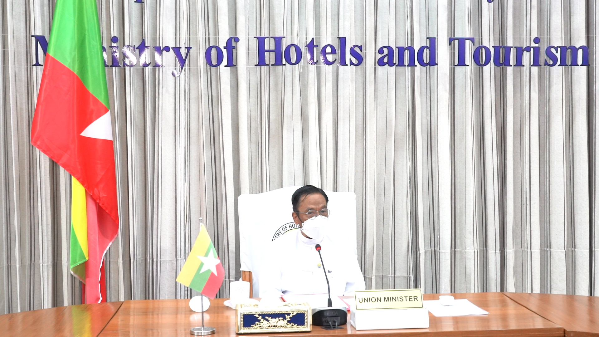 ဟိုတယ်နှင့်ခရီးသွားလာရေးဝန်ကြီးဌာန၊ ပြည်ထောင်စုဝန်ကြီး ဒေါက်တာဌေးအောင်နှင့် တာဝန်ရှိသူများသည် ယနေ့ မွန်းလွဲပိုင်းတွင် ဝန်ကြီးဌာန၊ နီလာခန်းမ၌ စပိန်နိုင်ငံ၊ မက်ဒရစ်မြို့၌ ကမ္ဘာ့ခရီးသွားလုပ်ငန်း အဖွဲ့ချုပ်မှ ကြီးမှူးကျင်းပသော ကမ္ဘာလှည့် ခရီးသွားများအား ကာကွယ်စောင့်ရှောက်ရေးဆိုင်ရာ နိုင်ငံတကာစံနှုန်းများ (International Code for the Protection of Tourists) နှင့် စပ်လျဉ်းသည့် အာရှ - ပစိဖိတ် ဒေသတွင်းဆွေးနွေးပွဲသို့ အွန်လိုင်းမှ တက်ရောက်သည်။