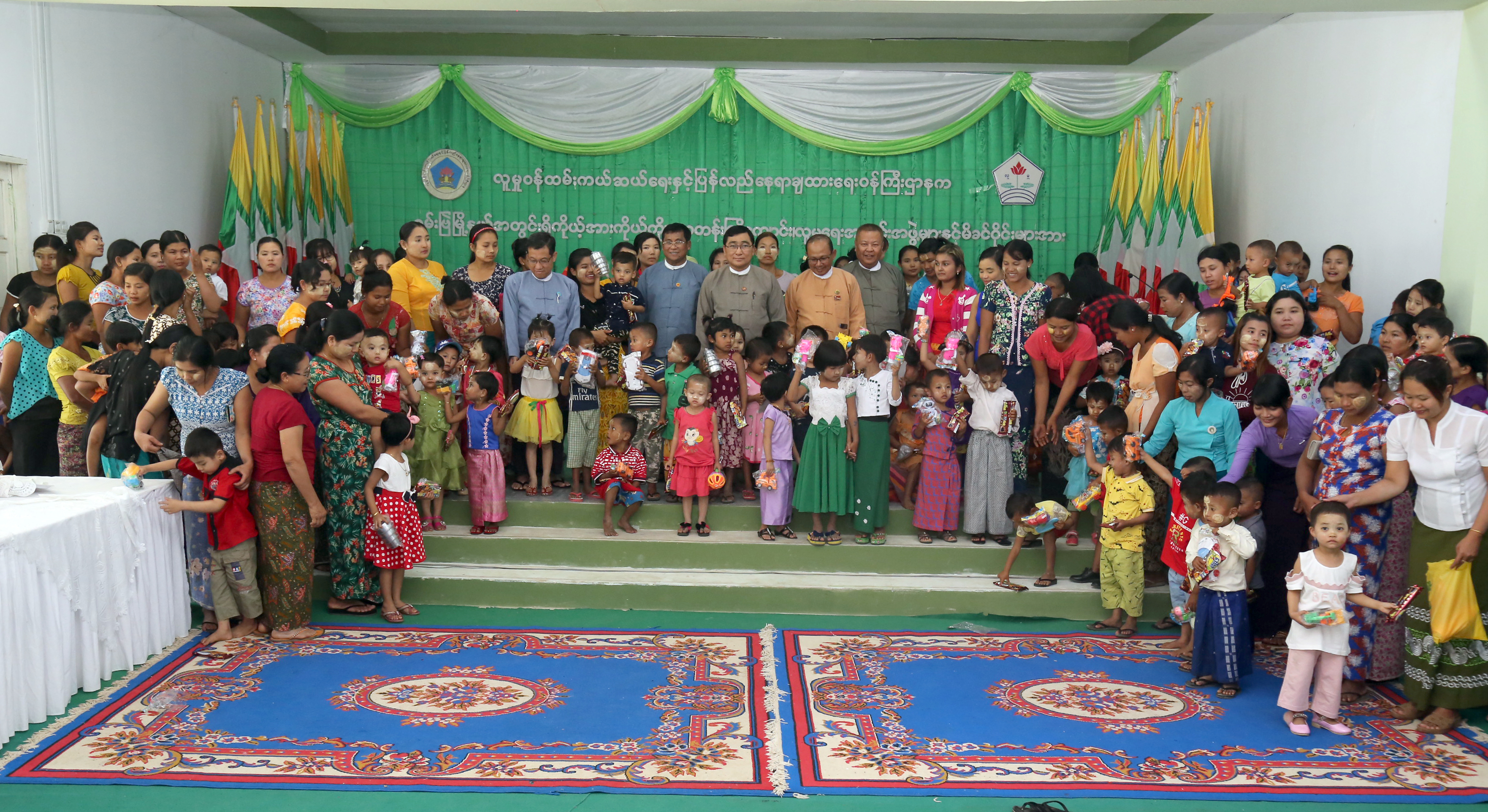 မွန်းလွဲပိုင်းတွင် ပြည်ထောင်စုဝန်ကြီးနှင့်အဖွဲ့သည် မအီမြို့သို့ရောက်ရှိပြီး မအီမြို့ အထွေထွေအုပ်ချုပ်ရေး ဦးစီးဌာန အစည်းအဝေးခန်းမ၌ မအီမြို့အမှတ်(၂)ရပ်ကွက် ကိုယ့်အားကိုယ်ကိုး မူလတန်းကြိုကျောင်းနှင့်  မေ့ဘေဘီ ကိုယ့်အားကိုယ်ကိုးမူလတန်း ကြိုကျောင်းများအတွက် တစ်ကျောင်းလျှင်ထောက်ပံ့ငွေ ကျပ် ၇၀ဝ၀ဝ၀၊ သဟာရက လူမှုရေးအသင်း၊ မေတ္တာရှင်လူမှုရေးအသင်းတို့အတွက် ထောက်ပံ့ငွေကျပ် ၆၀ဝ၀ဝ၀ နှင့် မိခင်ဝိုင်း(၅) ဝိုင်းအတွက် ထောက်ပံ့ငွေကျပ် ၃၂၁၈၁၀ဝ တို့ကို ပေးအပ်ရာ တာဝန်ရှိသူများက လက်ခံရယူကြပြီး ရပ်မိရပ်ဖတစ်ဦးက ကျေးဇူးတင်စကား ပြန်လည်ပြောကြားသည်။ ထို့နောက်  မိခင်ဝိုင်းခေါင်းဆောင်များနှင့် ကလေးသူငယ်များ၊ ရပ်မိရပ်ဖများ၊ လူမှုရေးအသင်း အဖွဲ့များနှင့် ဌာနဆိုင်ရာ တာဝန်ရှိသူများနှင့်အတူ စုပေါင်းမှတ်တမ်းတင် ဓါတ်ပုံရိုက်ကြသည်။