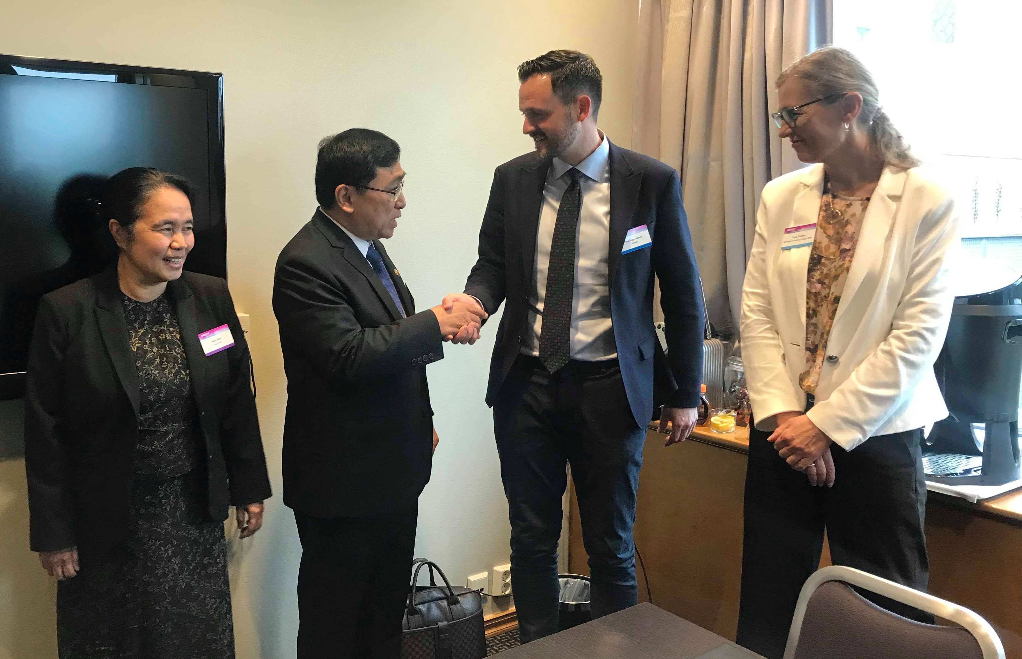 နော်ဝေနိုင်ငံ၊ အော်စလိုမြို့၌ ရောက်ရှိနေသော လူမှုဝန်ထမ်း၊ ကယ်ဆယ်ရေးနှင့် ပြန်လည်နေရာချထားရေးဝန်ကြီးဌာန၊ ပြည်ထောင်စုဝန်ကြီး ဒေါက်တာဝင်းမြတ်အေးသည် နော်ဝေအပြည်ပြည်ဆိုင်ရာ ဖွံ့ဖြိုးတိုးတက်ရေးဝန်ကြီး Mr. Dag-IngeUlstein နှင့် အပြည်ပြည်ဆိုင်ရာ ကြက်ခြေနီကော်မတီ (ICRC) အဖွဲ့မှ ညွှန်ကြားရေးမှူးချုပ် Mr. Yves Daccord နှင့်အဖွဲ့တို့အား ယမန်နေ့နံနက်ပိုင်းက Radisson Blu Hotel သီးသန့်ဧည့်ခန်းမဆောင်၌ သီးခြားစီတွေ့ဆုံသည်။