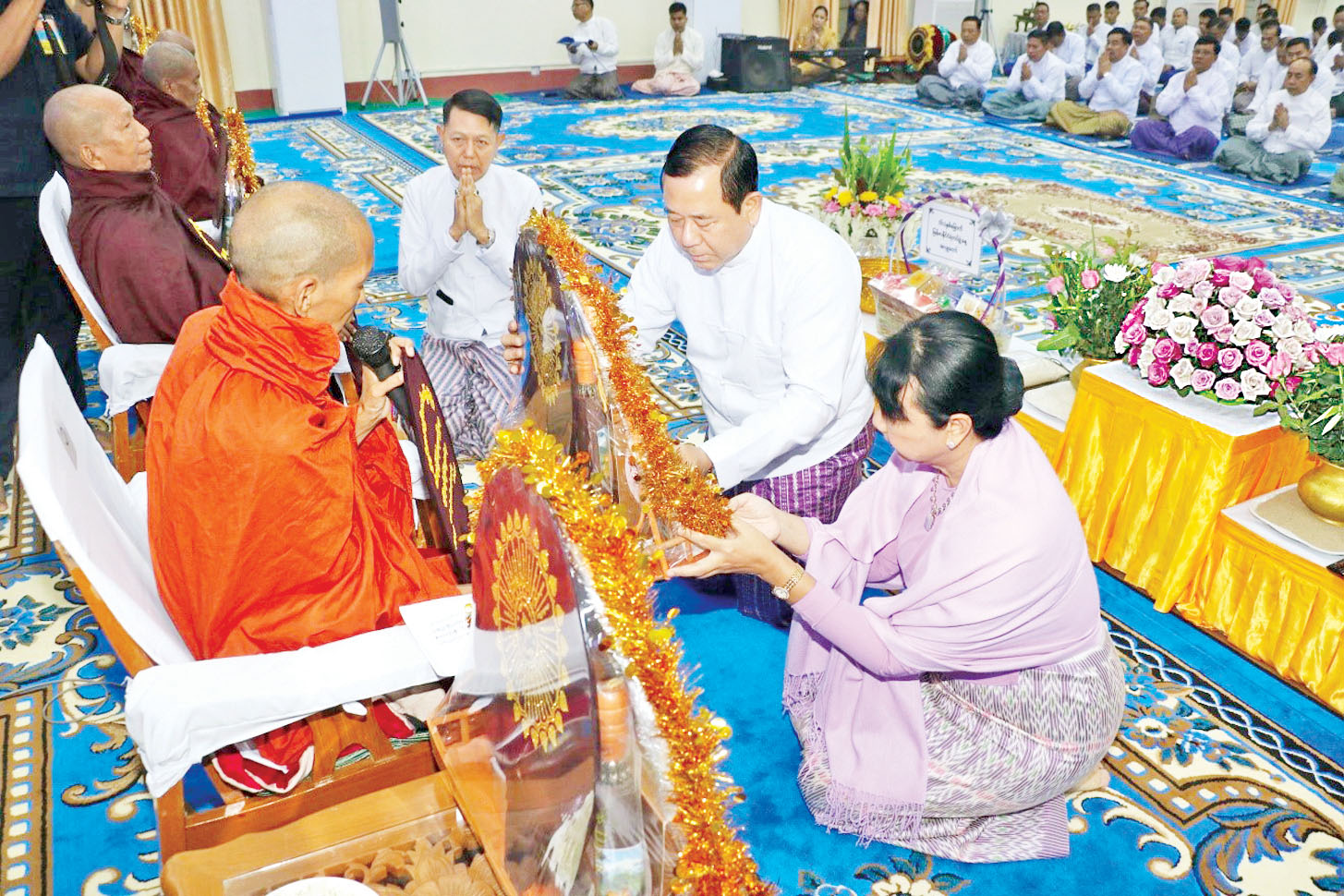 ဦးစွာ ပြည်ထောင်စုဝန်ကြီးနှင့် ဧည့်ပရိသတ် များက ပျဉ်းမနားမြို့ မင်္ဂလာဇေယျုံပါဠိတက္ကသိုလ် ကျောင်းတိုက်ဆရာတော် ဘဒ္ဒန္တဝိမလဗုဒ္ဓိထံမှ ငါးပါးသီလခံယူဆောက်တည်ကာ ဆရာတော်သံဃာ တော်များ ချီးမြှင့်အပ်သော ပရိတ်တရားတော်များကို နာယူကြည်ညိုကြသည်။