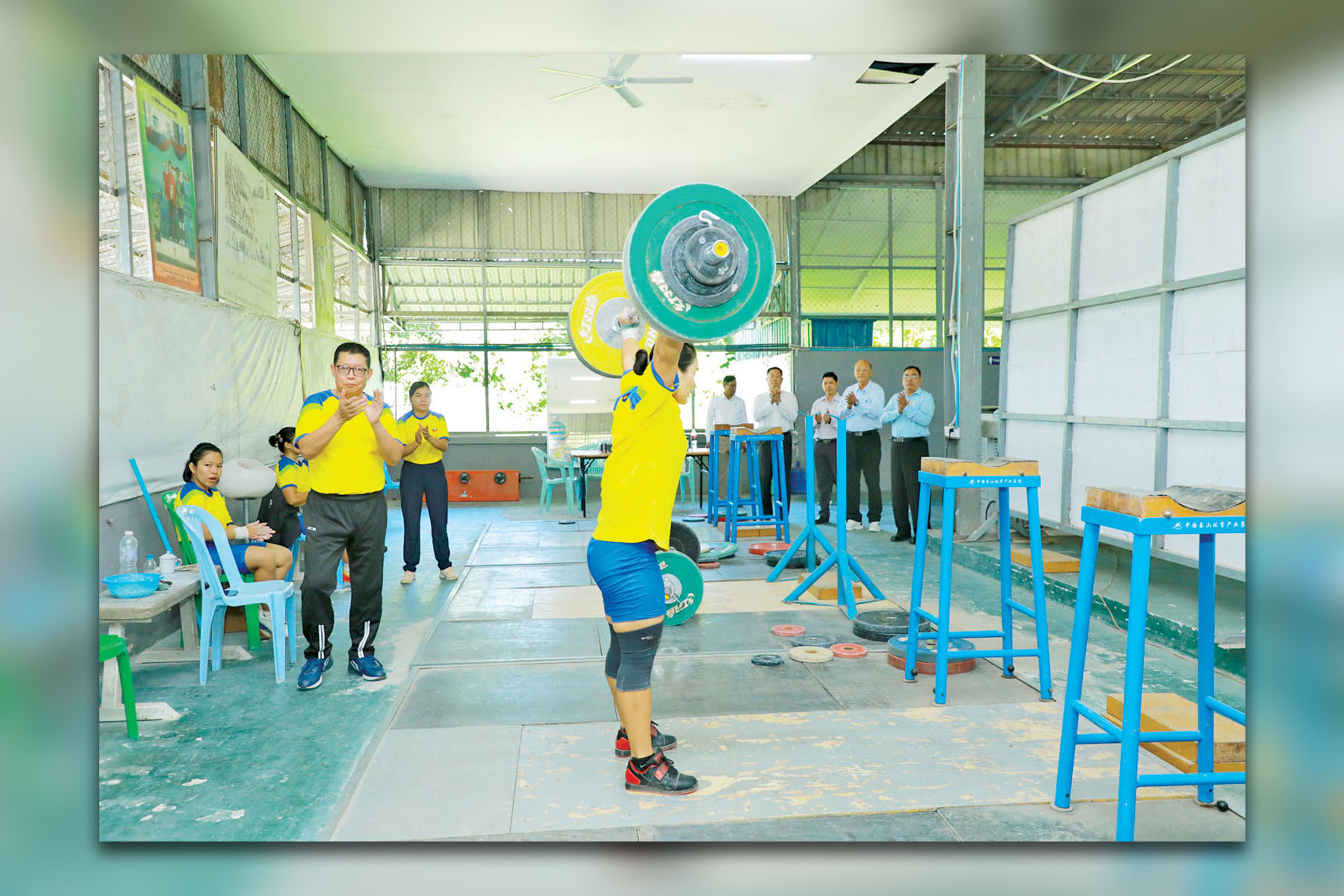 ဆက်လက်၍ ပြည်ထောင်စုဝန်ကြီးနှင့်အဖွဲ့သည် အလေးမလေ့ကျင့်ရေးရုံ၌ လေ့ကျင့်လျက်ရှိသည့် အလေးမအားကစားသမားများ၏ ဝိတ်တန်းများအလိုက် လေ့ကျင့်နေမှုများကို ကြည့်ရှုအားပေးပြီး မိမိတို့ရရှိထားသည့် စံချိန်ထက်သာလွန်ကောင်းမွန်စွာဖြင့် စံချိန်သစ်များရရှိခဲ့သည့် အားကစားသမားများနှင့် အုပ်ချုပ်/နည်းပြများအား ဂုဏ်ပြုထောက်ပံ့ငွေများ ပေးအပ်ချီးမြှင့်ပြီး ပြိုင်ပွဲကာလနီးကပ်လာပြီဖြစ်၍ ပြိုင်ပွဲတွင် စံချိန်သစ်များ ထပ်မံတင်နိုင်ရေးအတွက် ကိုယ်စွမ်းဉာဏ်စွမ်းရှိသမျှ ကြိုးစားသွားကြရန်နှင့် ထိခိုက်ဒဏ်ရာများမရရှိအောင် အထူးဂရုစိုက် လေ့ကျင့်သွားကြရန် မှာကြားသည်။
