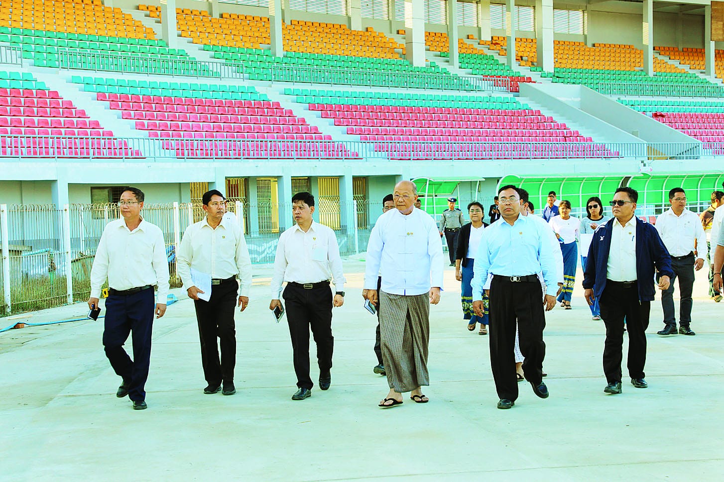 ယင်းနောက် ရှင်းလင်းဆောင်၌ သက်ဆိုင်ရာကုမ္ပဏီမှ တာဝန်ရှိသူက လုပ်ငန်းဆောင်ရွက်နေမှုများနှင့် ပတ်သက်ပြီး အသေးစိတ်ရှင်းလင်းတင်ပြရာ ပြည်ထောင်စုဝန်ကြီးက Synthetic ပြေးလမ်းအား သတ်မှတ်စံချိန်စံညွှန်းနှင့်အညီ အရည်အသွေးပြည့်မီစေရေးနှင့် သတ်မှတ်ကာလအတွင်း အချိန်မီပြီးစီးစေရေးတို့အတွက် တာဝန်ယူဆောင်ရွက်လျက်ရှိသည့် သက်ဆိုင်ရာကုမ္ပဏီမှ တာဝန်ရှိသူများအား မှာကြားကာ အားကစားကွင်း စိမ်းလန်းစိုပြည်စေရေးအတွက် ချုံနွယ်များ ရှင်းလင်းခြင်းနှင့် ပုံမှန်မြက်ဖြတ်ခြင်းလုပ်ငန်းများ ဆောင်ရွက်သွားရန် တာဝန်ရှိသူများကို မှာကြားသည်။