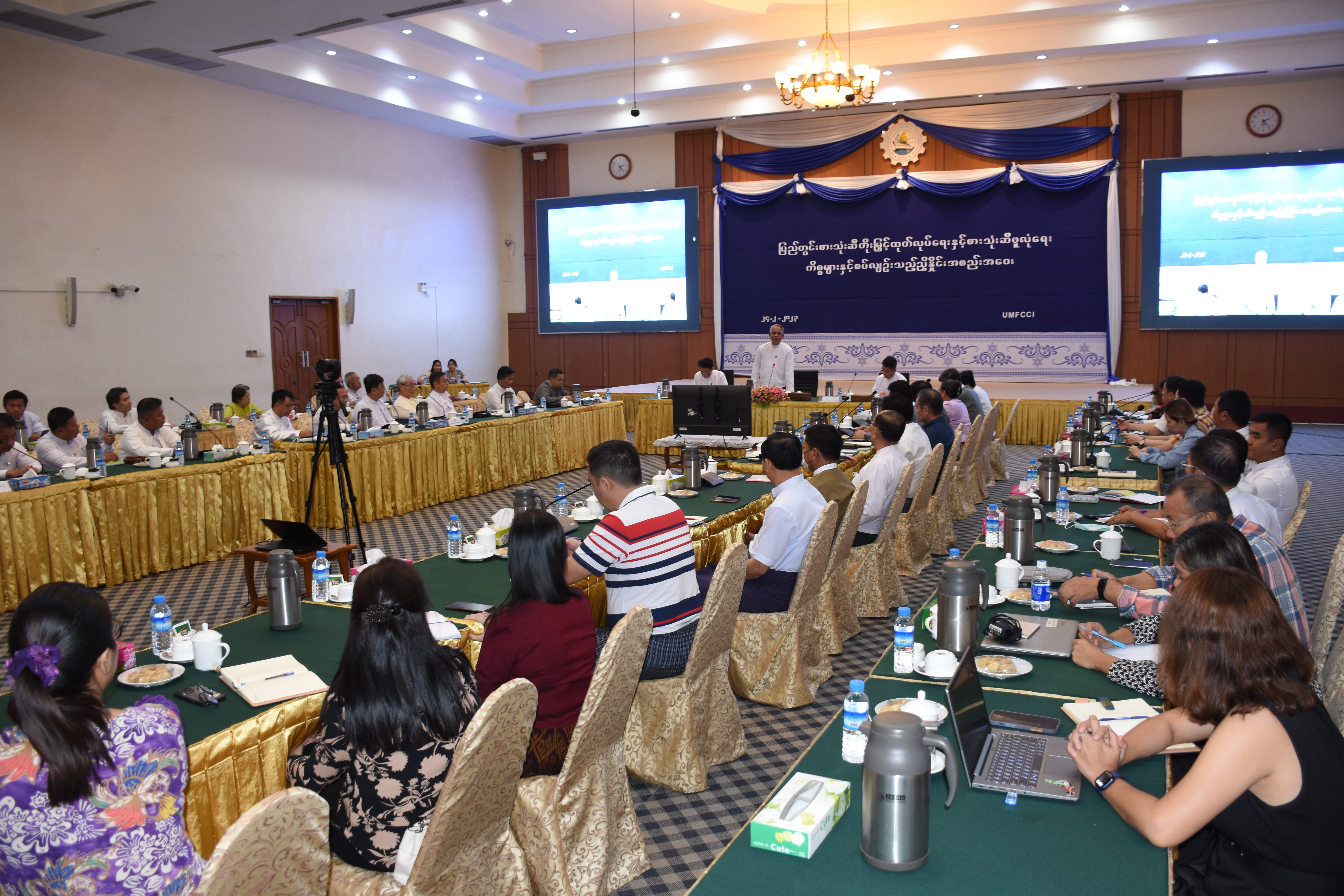 ဆွေးနွေးပွဲ မစတင်မီ ပြည်ထောင်စုဝန်ကြီးသည် ပြည်ထောင်စုသမ္မတမြန်မာနိုင်ငံ ကုန်သည်များနှင့် စက်မှုလက်မှုလုပ်ငန်းရှင်များအသင်းချုပ်ဥက္ကဌ၊ ဒုဥက္ကဌနှင့် တာဝန်ရှိသူ များနှင့် တွေ့ဆုံကာ နိုင်ငံတော်၏ စီးပွားရေးကဏ္ဍ ဖွံ့ဖြိုးတိုးတက်လာစေ ရန်အတွက် ပုဂ္ဂလိက ကဏ္ဍအား အသင်းချုပ်အနေဖြင့် အဓိကထား ဦးဆောင်၍ ပူးပေါင်းဆောင်ရွက်ရန်၊ ကုန်သွယ်မှုမြင့်တင်ရေး ဆိုင်ရာပူးပေါင်းရွက်ရေးနှင့် အသေးစား၊ အငယ်စား၊ အလတ်စား စီးပွားရေး လုပ်ငန်း (MSME) များကို အားပေးမြှင့်တင်ဆောင်ရွက်ရေးနှင့် ကုန်သွယ်မှု လျင်မြန်ချောမွေ့ရေးကိစ္စများ ဆွေးနွေး ခဲ့ကြကြောင်း သိရသည်။