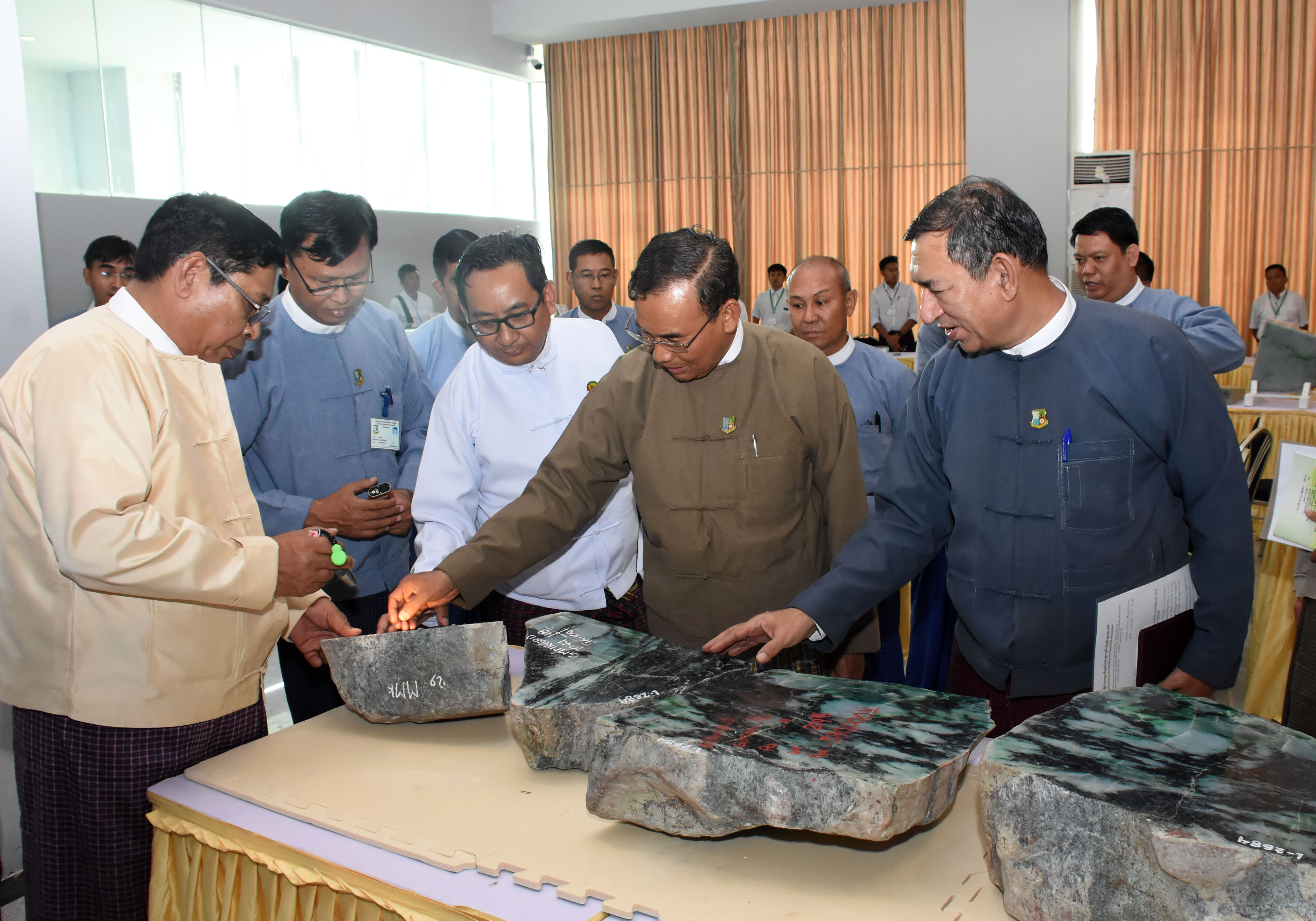 နေပြည်တော် မဏိရတနာကျောက်စိမ်းခန်းမ၌ (၅၆)ကြိမ်မြောက် မြန်မာ့ကျောက်မျက်ရတနာပြပွဲတွင် ခင်းကျင်းပြသမည့် ကျောက်စိမ်းအတွဲများ၊ ကျောက်မျက်အတွဲများကို တင်ဒါစနစ်တို့ဖြင့် ရောင်းချမည့် အစီအစဉ်များ၊ ရတနာကုန်သည်များ ကြည့်ရှုဝယ်ယူနိုင်ရေးအတွက် ဆောင်ရွက်ထားသည့် အစီအစဉ်များကို သယံဇာတနှင့် သဘာဝပတ်ဝန်းကျင် ထိန်းသိမ်းရေးဝန်ကြီးဌာန၊ ပြည်ထောင်စုဝန်ကြီး ဦးအုန်းဝင်းသည် ယနေ့ နံနက်ပိုင်းတွင် လှည့်လည်ကြည့်ရှု စစ်ဆေးရာ မြန်မာ့ကျောက်မျက်ရတနာ ရောင်းဝယ်ရေးလုပ်ငန်း၊ ဦးဆောင်ညွှန်ကြားရေးမှူးနှင့် တာဝန်ရှိသူများက လုပ်ငန်းဆောင်ရွက်ထားရှိမှုများကို ရှင်းလင်းတင်ပြကြသည်။