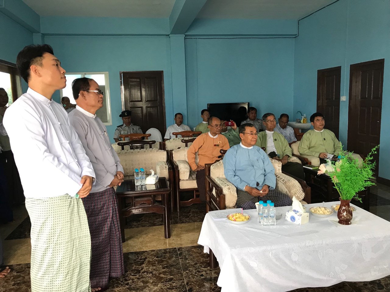 ယင်းနောက် ပြည်ထောင်စုဝန်ကြီးနှင့်အဖွဲ့သည် ရန်ကုန်တိုင်းဒေသကြီး၊ မှော်ဘီမြို့နယ်အတွင်းရှိ ဗဟိုသစ်တောလုပ်ငန်းဖွံ့ဖြိုးမှုနှင့် လေ့ကျင့်ပညာပေးရေးဌာန ဧည့်ခန်းမတွင် သင်တန်းကျောင်း တာဝန်ရှိသူများနှင့် တွေ့ဆုံသည်။