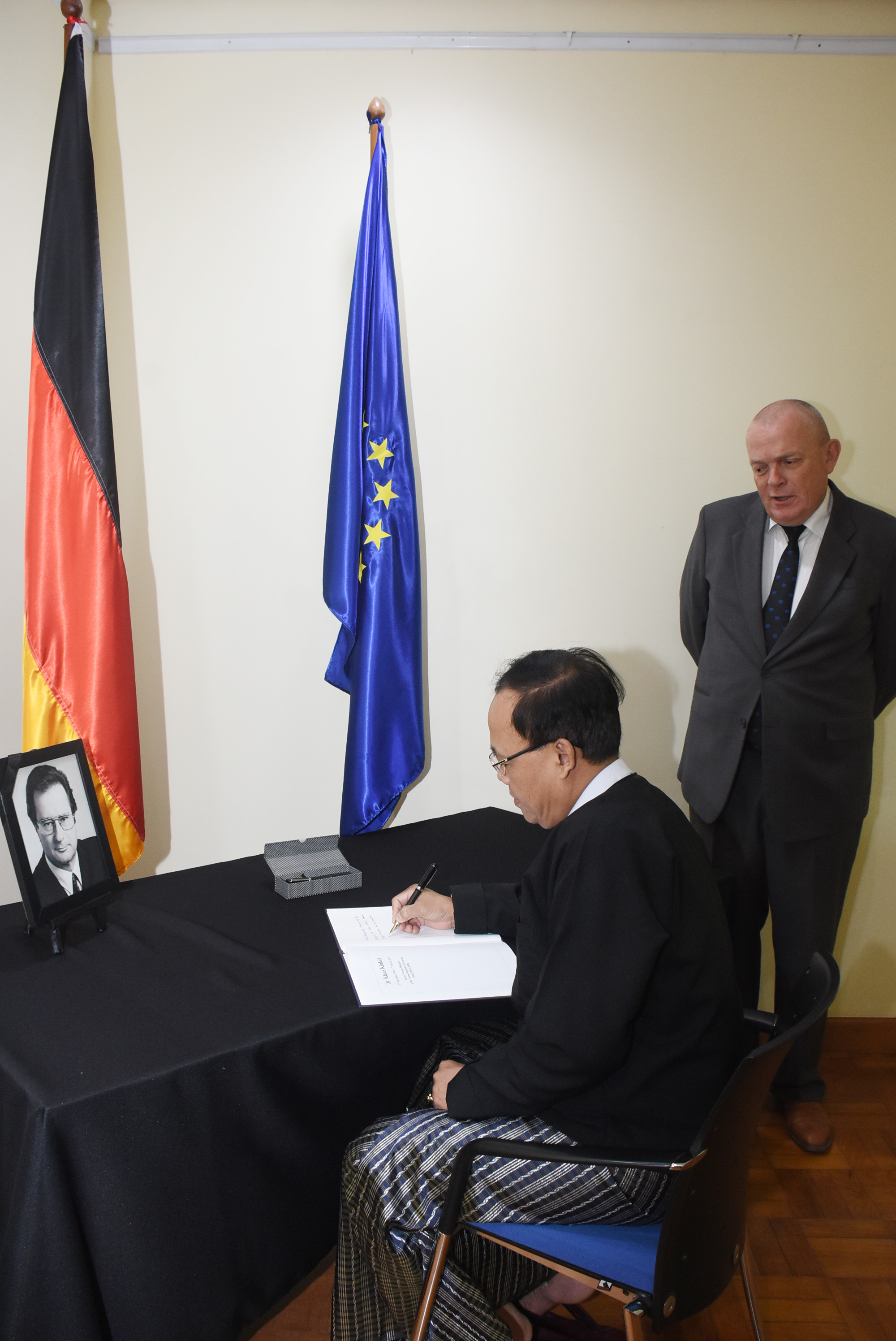 အပြည်ပြည်ဆိုင်ရာ ပူးပေါင်းဆောင်ရွက်ရေးဝန်ကြီးဌာန၊ ပြည်ထောင်စုဝန်ကြီး ဦးကျော်တင်သည် ယနေ့နံနက် ၁၀ နာရီခွဲတွင် ဂျာမနီနိုင်ငံ၏ နိုင်ငံခြားရေးဝန်ကြီးဟောင်း H.E Dr. Klaus Kinkel ကွယ်လွန်သွားခြင်းအတွက် ရန်ကုန်မြို့၊ ဗဟန်းမြို့နယ်၊ အမှတ်(၉) ဗိုလ်ချုပ်ပြတိုက်လမ်းရှိ ဂျာမနီသံရုံးတွင် ဖွင့်လှစ်ထားရှိသည့် ဝမ်းနည်းခြင်းအထိမ်းအမှတ် စာအုပ်၌ လက်မှတ်ရေးထိုးသည်။