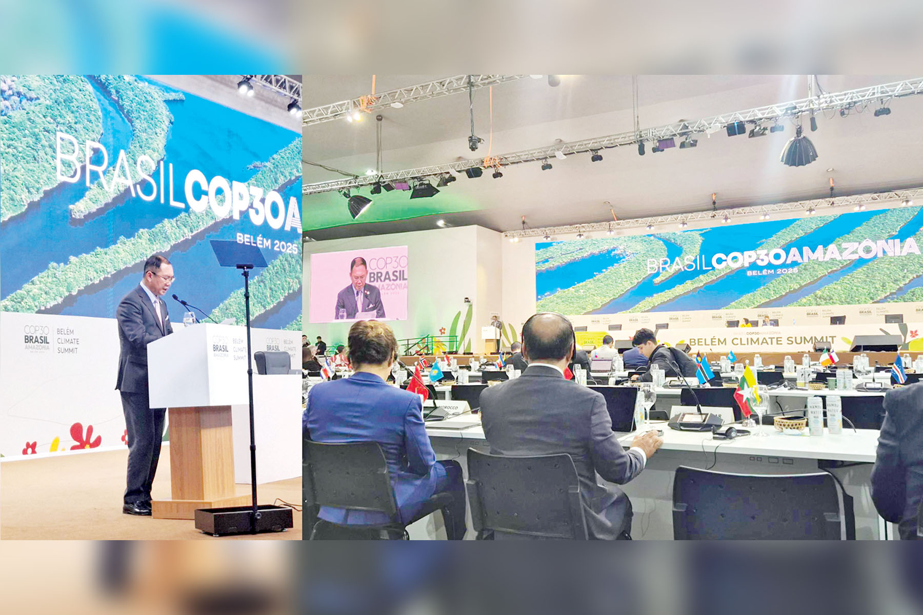 ဘရာဇီးနိုင်ငံသမ္မတ လူးဝစ်အင်နာစီယိုလူလာဒါဆေးလ်ဗား၏ ဖိတ်ကြားချက်အရ ပြည်ထောင်စုသမ္မတမြန်မာနိုင်ငံတော်ယာယီသမ္မတ နိုင်ငံတော်လုံခြုံရေးနှင့် အေးချမ်းသာယာရေးကော်မရှင်ဥက္ကဋ္ဌ ဗိုလ်ချုပ်မှူးကြီး မင်းအောင်လှိုင်(ကိုယ်စား) သယံဇာတနှင့်သဘာဝပတ်ဝန်းကျင် ထိန်းသိမ်းရေးဝန်ကြီးဌာန ပြည်ထောင်စုဝန်ကြီး ဦးခင်မောင်ရီဦးဆောင်သော မြန်မာကိုယ်စားလှယ်အဖွဲ့သည် ဘရာဇီးနိုင်ငံဘဲလ်လမ်မြို့၌ နိုဝင်ဘာ ၆ ရက်မှ ၇ ရက်အထိ ကျင်းပသည့် ဘဲလ်လမ်ရာသီဥတုဆိုင်ရာ ထိပ်သီးအစည်းအဝေး (Belem Climate Summit) ဒုတိယနေ့ စုံညီအစည်းအဝေးနှင့် ဘာသာရပ်ဆိုင်ရာ စားပွဲဝိုင်းဆွေးနွေးပွဲများသို့ တက်ရောက်ခဲ့သည်။