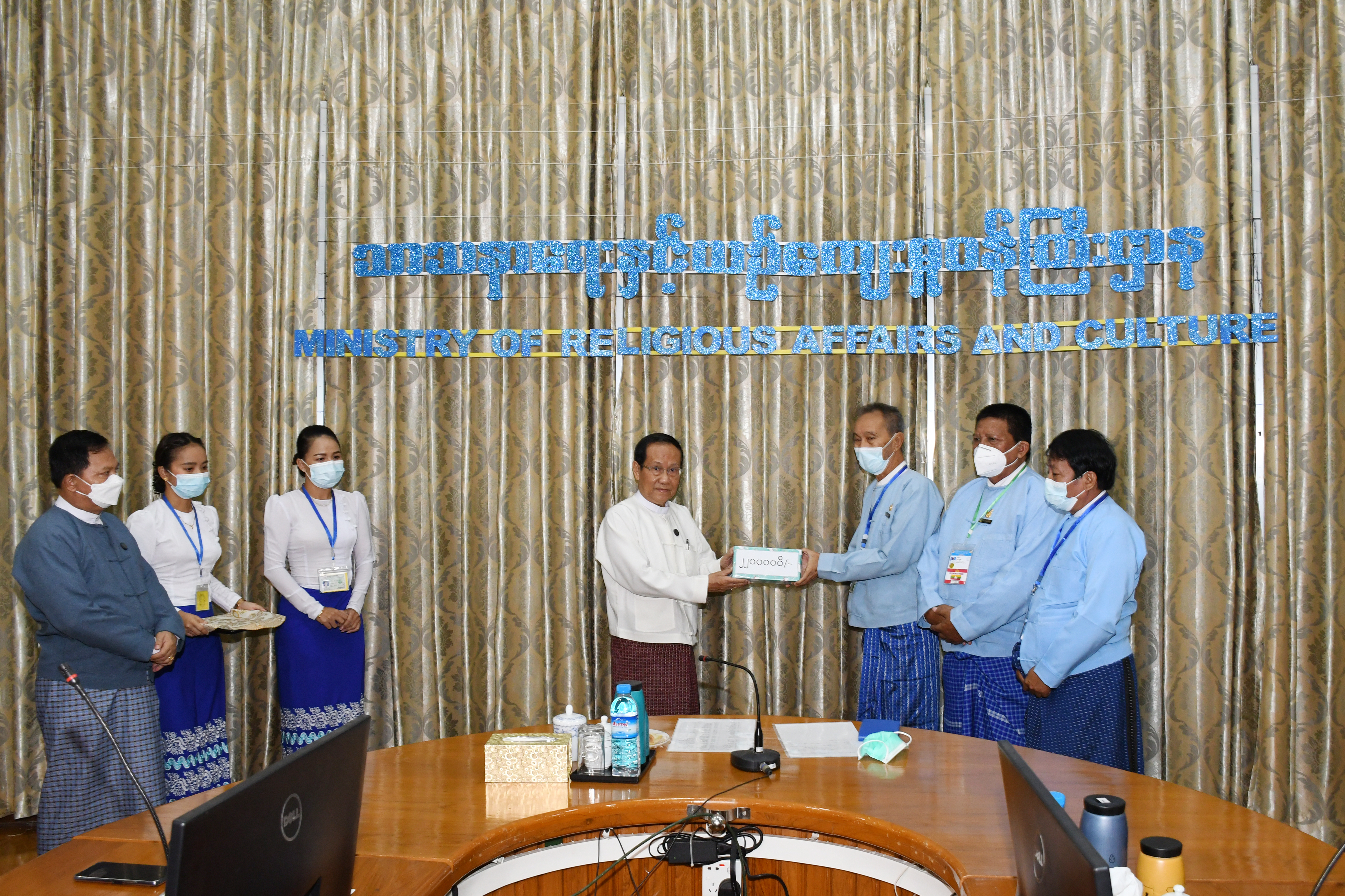 ဆက်လက်၍ ပြည်ထောင်စုဝန်ကြီး ဦးကိုကိုက မြန်မာနိုင်ငံသဘင်အစည်းအရုံး (ဗဟို) သို့ ငွေကျပ် ၂၂ သိန်းကို ထောက်ပံ့ပေးအပ်ရာ အစည်းအရုံးဥက္ကဋ္ဌ ဦးစိန်မြအောင်၊ အတွင်းရေးမှူး ဦးနေဝင်းနှင့် ဗဟိုကော်မတီဝင် ဦးမြစည်သူတို့က လက်ခံရယူကြသည်။