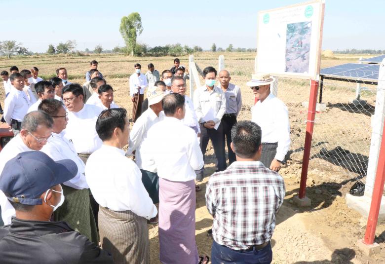 ထို့နောက် ပြည်ထောင်စုဝန်ကြီးနှင့်အဖွဲ့သည် နိုင်ငံတော်ထောက်ပံ့ရန်ပုံငွေဖြင့် ဆောင်ရွက် ထားရှိသည့် ကွင်းအမှတ် (၁၆၇၇) ၌ နေကြာစိုက်ဧက (၃၅၃) ဧကအား ဆိုလာရေတင်စနစ်ဖြင့် စိုက်ပျိုးရေ ရရှိရေးလုပ်ငန်း ဆောင်ရွက်ထားရှိမှုကို ကြည့်ရှုစစ်ဆေးခဲ့ပြီး ရေရှည်ထိန်းသိမ်းရေး၊ ဌာနများနှင့် တောင်သူအစုအဖွဲ့များ တာဝန်ခွဲဝေ သတ်မှတ်ဆောင်ရွက်ရေးနှင့် စိုက်ပျိုးရာသီအမှီ ရေပေးဝေနိုင်ရေးအတွက် ဒီဇင်ဘာလကုန်အပြီး ဆောင်ရွက်ရေးတို့ကို မှာကြားသည်။