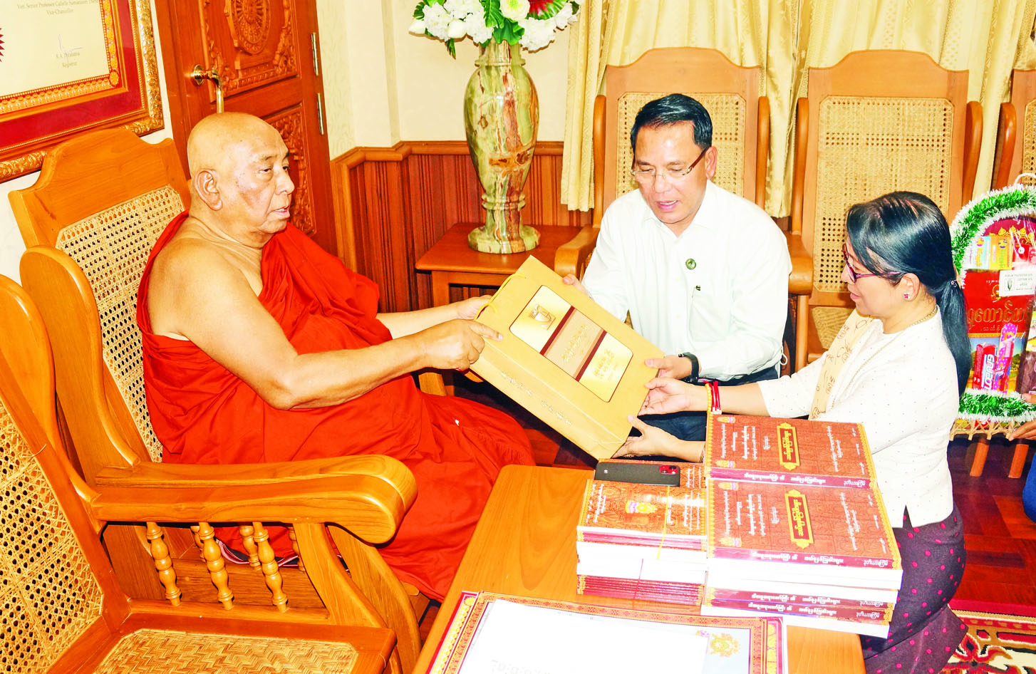 ထို့နောက် ဆရာတော်ကြီးအား ပြည်ထောင်စုဝန်ကြီးက အလှူငွေနှင့် လှူဖွယ်ဝတ္ထုပစ္စည်းများ၊ ပြန်ကြားရေးဝန်ကြီးဌာနမှ ထုတ်ဝေသော စာအုပ်စာစောင် များကို ပေးအပ်လှူဒါန်းသည်။