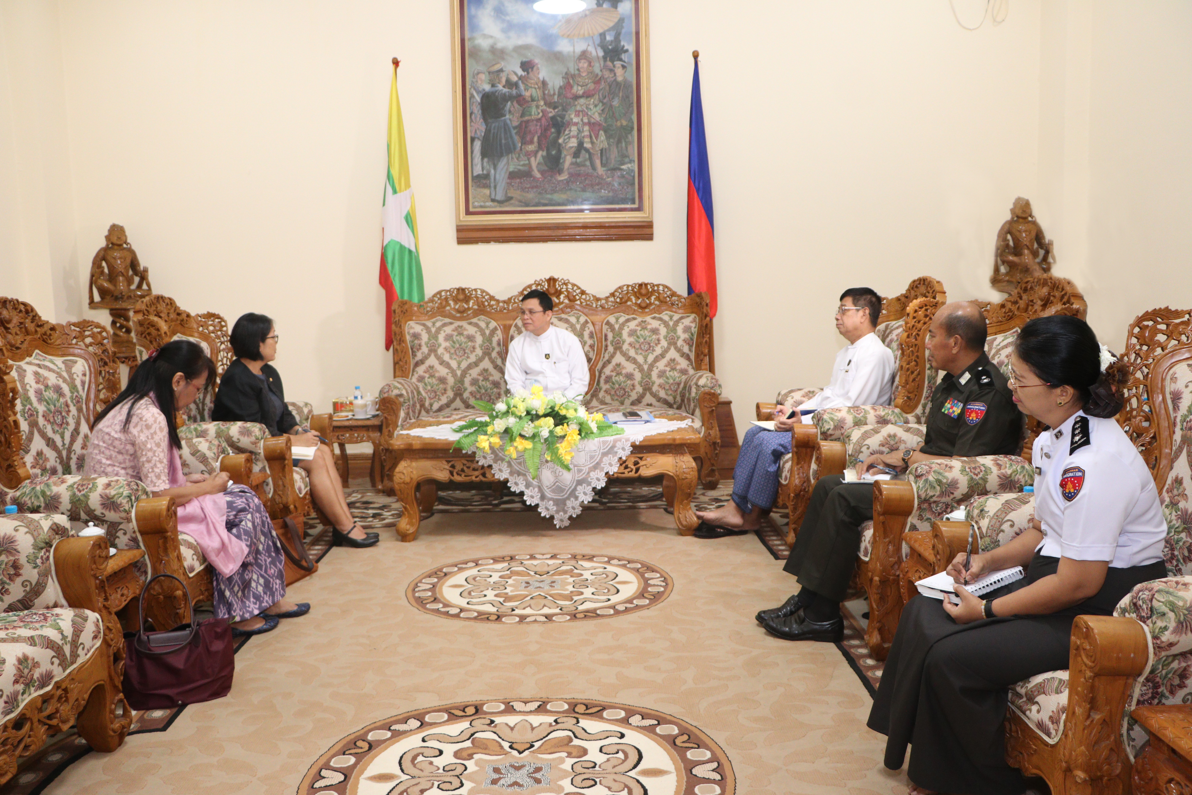 တွေ့ဆုံပွဲသို့ ပြည်ထောင်စုဝန်ကြီးနှင့်အတူ ဒုတိယဝန်ကြီး ဦးဌေးလှိုင်နှင့် တာဝန်ရှိသူများ တက်ရောက်ကြပြီး ရခိုင်ပြည်နယ်မှ နေရပ်စွန့်ခွာသူများ ပြန်လည်လက်ခံရေးလုပ်ငန်းအတွက် ဝန်ကြီးဌာနနှင့် UNHCR တို့ နှစ်ပေါင်းများစွာ လက်တွဲပူးပေါင်းဆောင်ရွက်ခဲ့မှု၊ လက်ရှိကာလတွင် ဝန်ကြီးဌာနနှင့် UNDP-UNHCR တို့အကြား သုံးပွင့်ဆိုင် နားလည်မှုစာချွန်လွှာ(MoU) ရေးထိုးဆောင်ရွက်မှု၊ လုပ်ငန်းများ ဆက်လက်ပူးပေါင်း ဆောင်ရွက်နိုင်ရေးအတွက် MoU သက်တမ်းတိုးမြှင့်နိုင်ရန် လိုအပ်သည့်လုပ်ငန်းအခြေအနေ၊ ပကတိ မြေပြင်အခြေအနေ ဖြစ်ရပ်အမှန်ကို မသိရှိဘဲ ပြည်ပအဖွဲ့အစည်းတချို့နှင့် ပြည်ပမီဒီယာတချို့၏ ထုတ်ပြန်ချက်များ၊ ထုတ်လွှင့်မှုများကြောင့် လုပ်ငန်းများအဟန့်အတားဖြစ်၍ နှောင့်နှေးကြန့်ကြာနေမှု၊ နိုင်ငံတော်အစိုးရအနေဖြင့် ရခိုင်ပြည်နယ်မှ နေရပ်စွန့်ခွာသူများ ပြန်လည်လက်ခံရေးလုပ်ငန်း အောင်မြင်ရေးအတွက် တစိုက်မတ်မတ် ကြိုးပမ်းဆောင်ရွက်နေမှု၊ UNHCR အနေဖြင့် နေရပ်စွန့်ခွာသူများ ပြန်လည်လက်ခံရေးလုပ်ငန်းအပြင် လက်ရှိဆိုင်ကလုန်းမုန်တိုင်းဒဏ် ခံစားရသည့် ဒေသများသို့လည်း ကူညီထောက်ပံ့ရေးလုပ်ငန်းများ ဆောင်ရွက်သွားမည့် အခြေအနေ၊ လုပ်ငန်းများဆောင်ရွက်ရာတွင် ဝန်ကြီးဌာနနှင့် UNHCR တို့အကြား ရင်းနှီးပွင့်လင်းစွာ တွေ့ဆုံဆွေးနွေးအဖြေရှာ ဆောင်ရွက်နိုင်ရေးတို့နှင့်စပ်လျဉ်း၍ အမြင်ချင်းဖလှယ် ဆွေးနွေးခဲ့ကြသည်။