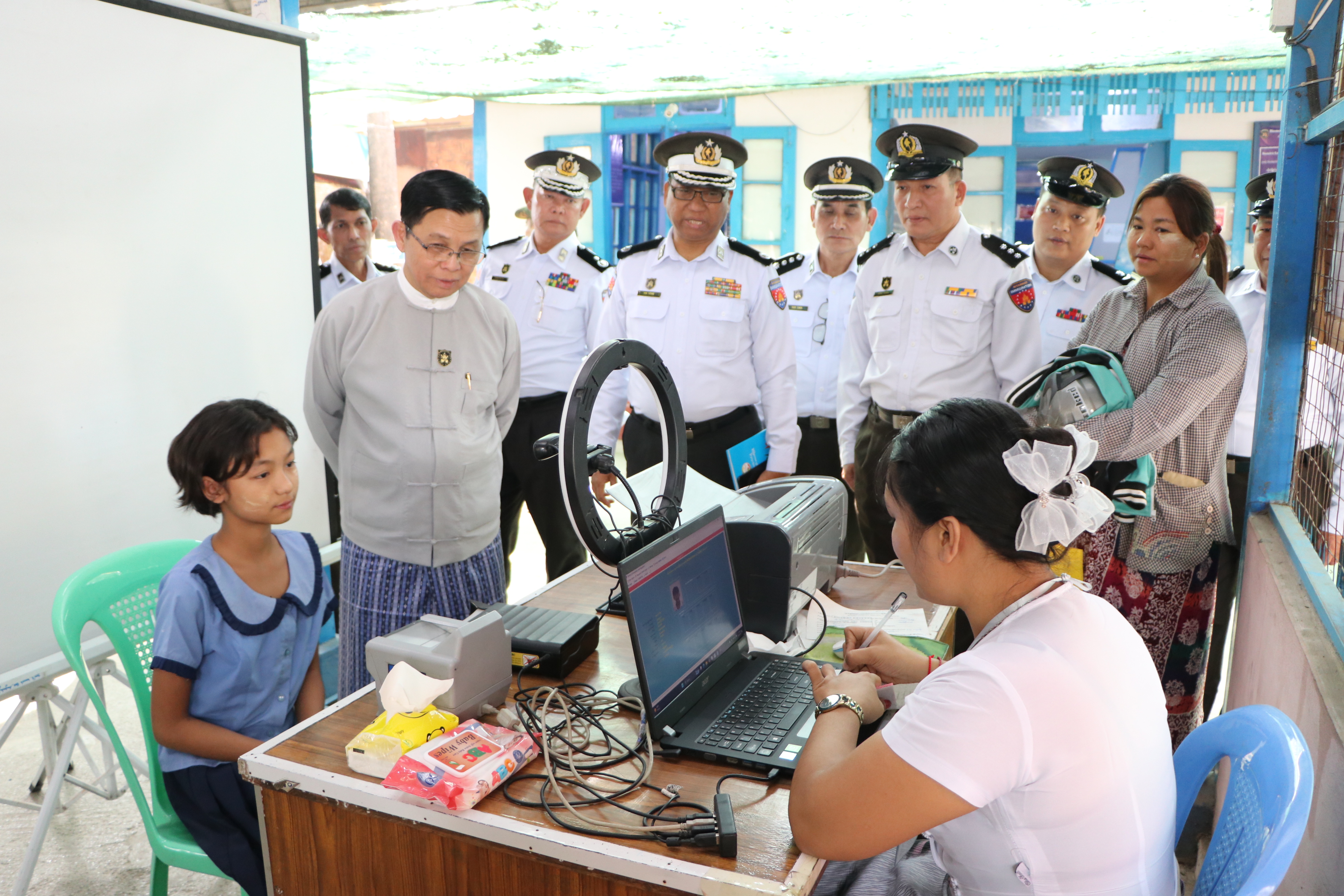 ထိုမှတစ်ဆင့် ပြည်ထောင်စုဝန်ကြီးသည် ချမ်းအေးသာစံမြို့နယ်၊ ကန်ကောက်ရပ်ကွက်ရှိ ဝါးခင်းကုန်း ဓမ္မာရုံ၌ ချမ်းအေးသာစံမြို့နယ် ဦးစီးမှူးရုံးမှဝန်ထမ်းများက ဒေသခံပြည်သူများကို ပန်းခင်းစီမံချက် အဆင့်(၃)ဖြင့် လုပ်ငန်းစဉ်အဆင့်အလိုက် နိုင်ငံသားစိစစ်ရေးကတ်ပြား စိစစ်ဆောင်ရွက်ပေးနေမှု၊ နိုင်ငံသားကတ်ပြား ရရှိသူများအား e-ID စနစ်ဖြင့် ကိုယ်ရေးအချက်အလက် (Biographic) နှင့် ဇီဝဆိုင်ရာ အချက်အလက် (Biometric) ကောက်ယူ၍ ဂဏန်း(၁၀)လုံးပါ Unique ID နံပါတ်ထုတ်ပေးဆောင်ရွက် နေမှုတို့ကို ကြည့်ရှုအားပေးကာ တာဝန်ရှိသူများအား လုပ်ငန်းလိုအပ်ချက်များ ညှိနှိုင်းဆောင်ရွက်ပေးပြီး လာရောက်ဆောင်ရွက်ကြသည့် ပြည်သူများကို ရင်းရင်း နှီးနှီးနှုတ်ဆက်အားပေးသည်။