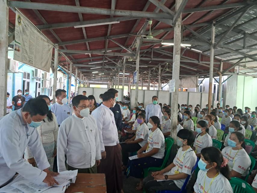 ဦးစွာ ပြည်ထောင်စုဝန်ကြီးသည် ကျွမ်းကျင်မှုလေ့ကျင့်ရေး သင်တန်းကျောင်း (မြောက်ဒဂုံ) ၌ ထိုင်းနိုင်ငံသို့ MoU စနစ်ဖြင့် စေလွှတ်ရန် Trade Win အေဂျင်စီအပါအဝင် အေဂျင်စီ ၈ ခုတို့မှ အလုပ်သမား ၈၅၁ ဦးတို့ကို အလုပ်ခန့်ထားမှုဆိုင်ရာ သဘောတူစာချုပ် ချုပ်ဆိုနေမှုနှင့် Golden Plant အေဂျင်စီ အပါအဝင် အေဂျင်စီ ၃ ခုတို့မှ အမျိုးသား ၄၃၀၊ အမျိုးသမီး ၃၇၀ ၊ စုစုပေါင်း ၈၀၀ တို့ကို OWIC ပြုလုပ်ပေးနေမှုကို ကြည့်ရှု စစ်ဆေးသည်။