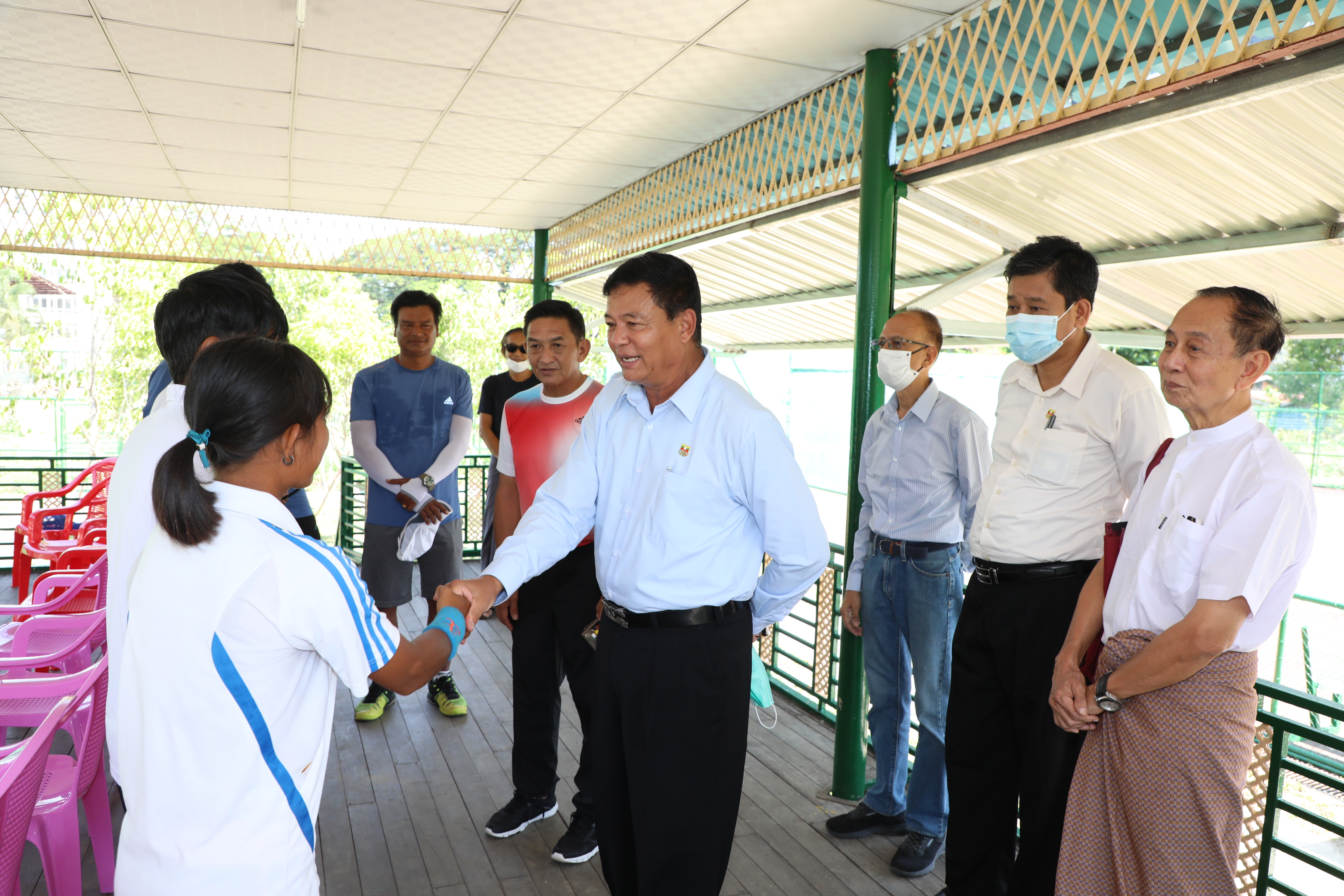 ထို့နောက် မင်္ဂတောင်ညွန့်မြို့နယ်ရှိ သိမ်ဖြူတင်းနစ်အားကစားကွင်းသို့ ရောက်ရှိပြီး (၃၂)ကြိမ် မြောက်အရှေ့တောင်အာရှ အားကစားပြိုင်ပွဲသို့ ဝင်ရောက်ယှဉ်ပြိုင်ရန် လေ့ကျင့်နေသော လက်ရွေးစင် အားကစားသမားများ၏ လေ့ကျင့်နေမှုကိုကြည့်ရှုပြီး အားကစားသမားများနှင့် ရင်းရင်းနှီးနှီးတွေ့ဆုံ အမှာစကားပြောကြားသည်။