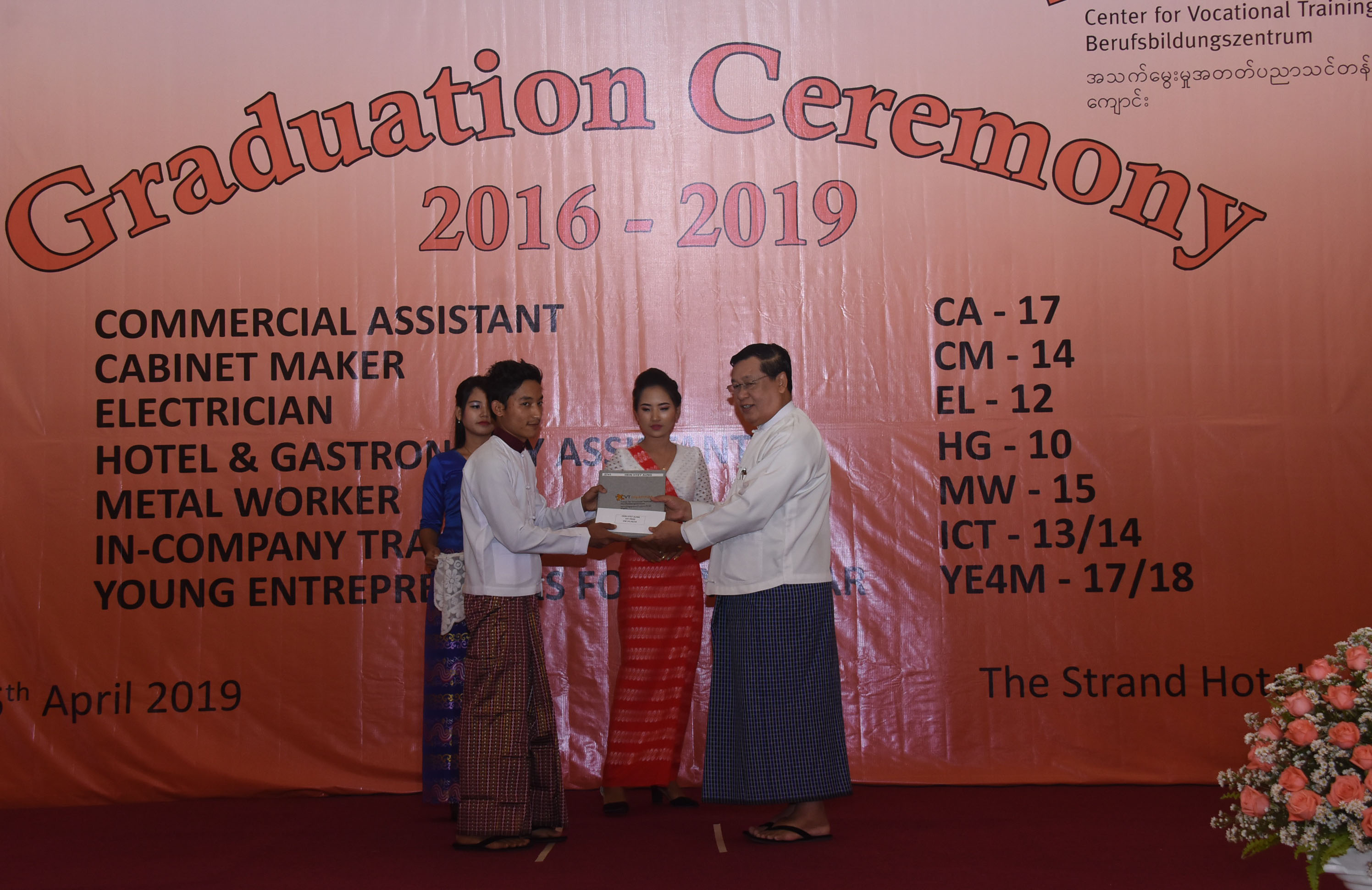 ထို့နောက် ပြည်ထောင်စုဝန်ကြီးနှင့် တာဝန်ရှိသူများက အလုပ်အကိုင် ၅ မျိုးအတွက် သင်တန်းဆင်း အောင်လက်မှတ်များကို ပေးအပ်ကြသည်။