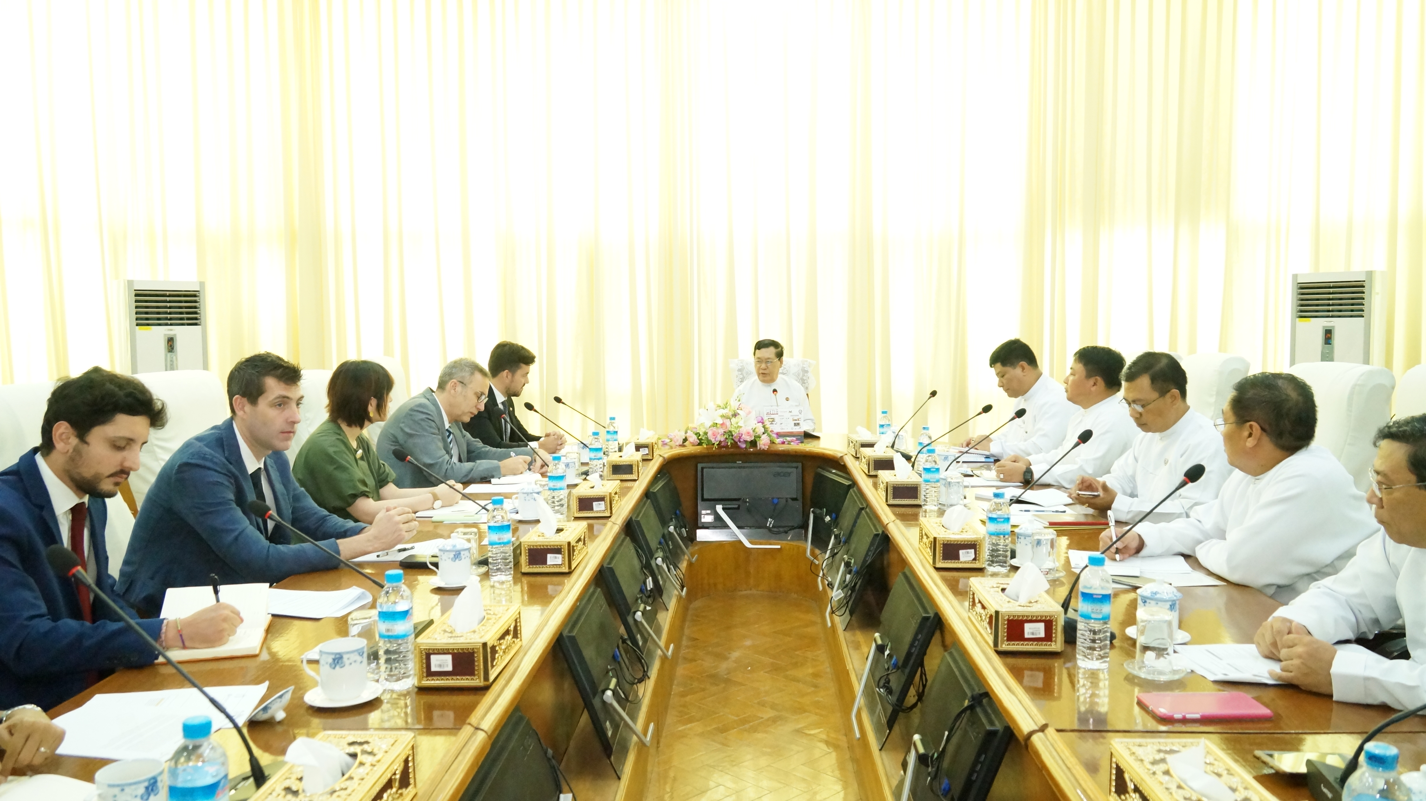 တွေ့ဆုံစဉ် ၂၀၁၉ ခုနှစ် မတ်လအတွင်း Euro Cham Myanmar မှ ဆွေးနွေးအကြံပြုခဲ့သည့် အချက်အလက်များနှင့်ပတ်သက်၍ ဖြစ်ပေါ်တိုးတက်ဆောင်ရွက်ထားရှိမှု ဆွစ်ဇာလန်နိုင်ငံ၊ ဂျီနီဗာမြို့တွင် ဇွန်လအတွင်း ကျင်းပမည့် ၁၀၈ ကြိမ်မြောက် ILC ညီလာခံ၌ အလုပ်သမားရေးရာကိစ္စ တိုးတက်ဆောင်ရွက်ထားရှိမှုများနှင့် မြန်မာနိုင်ငံ၏ ရင်ဆိုင်နေရသော စိန်ခေါ်မှုများကို ဖြေရှင်းနိုင်ရေးအတွက် အလုပ်ရှင်၊ အလုပ်သမားများ အပါအဝင် သက်ဆိုင်ရာ မိတ်ဖက်ဝန်ကြီးဌာနများ ILO၊ IOM နိုင်ငံတကာအဖွဲ့အစည်းများနှင့် EU အပါအဝင် ဖွံ့ဖြိုးမှုမိတ်ဖက်များနှင့်အတူတကွ ပူးပေါင်းဆောင်ရွက်နေမှု၊ ရခိုင်ပြည်နယ် တည်ငြိမ်အေးချမ်းရေးနှင့်ပတ်သက်၍ မြန်မာနိုင်ငံအနေဖြင့် ဘင်္ဂလားဒေ့ရှ်နိုင်ငံ နှင့် MOU ရေးထိုးပြီး နှစ်နိုင်ငံအကောင်အထည်ဖော်နိုင်ရေး ဆွေးနွေးမှုများ၊ သတင်းလွတ်လပ်ခွင့်များရှိအောင် ဆောင်ရွက်ပေးနေမှု၊ အလုပ်သမားအဖွဲ့အစည်းဥပဒေနှင့် ပတ်သက်၍လည်း အလုပ်ရှင်၊ အလုပ်သမားများ၏ တင်ပြချက်များကို ထည့်သွင်းစဉ်းစား၍ ဌာနတွင်း ဆွေးနွေးဆောင်ရွက်နေမှုကိစ္စရပ်များနှင့် စပ်လျဉ်း၍ ရင်းနှီးပွင့်လင်းစွာ ဆွေးနွေးခဲ့ကြကြောင်း သိရသည်။