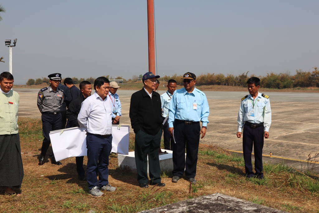 ပြည်ထောင်စုဝန်ကြီးသည် ဖေဖော်ဝါရီ ၂၄ ရက် မွန်းလွဲပိုင်းတွင် တာချီလိတ်မြို့ တာချီလိတ်လေဆိပ် လေယာဉ်ပြေးလမ်းအဆင့်မြှင့်တင်နိုင်ရန် စီမံထားရှိမှုကို ကြည့်ရှုစစ်ဆေးရာ ညွှန်ကြားရေးမှူး ဦးကျော်စိုးက ရှင်းလင်းတင်ပြသည်။
