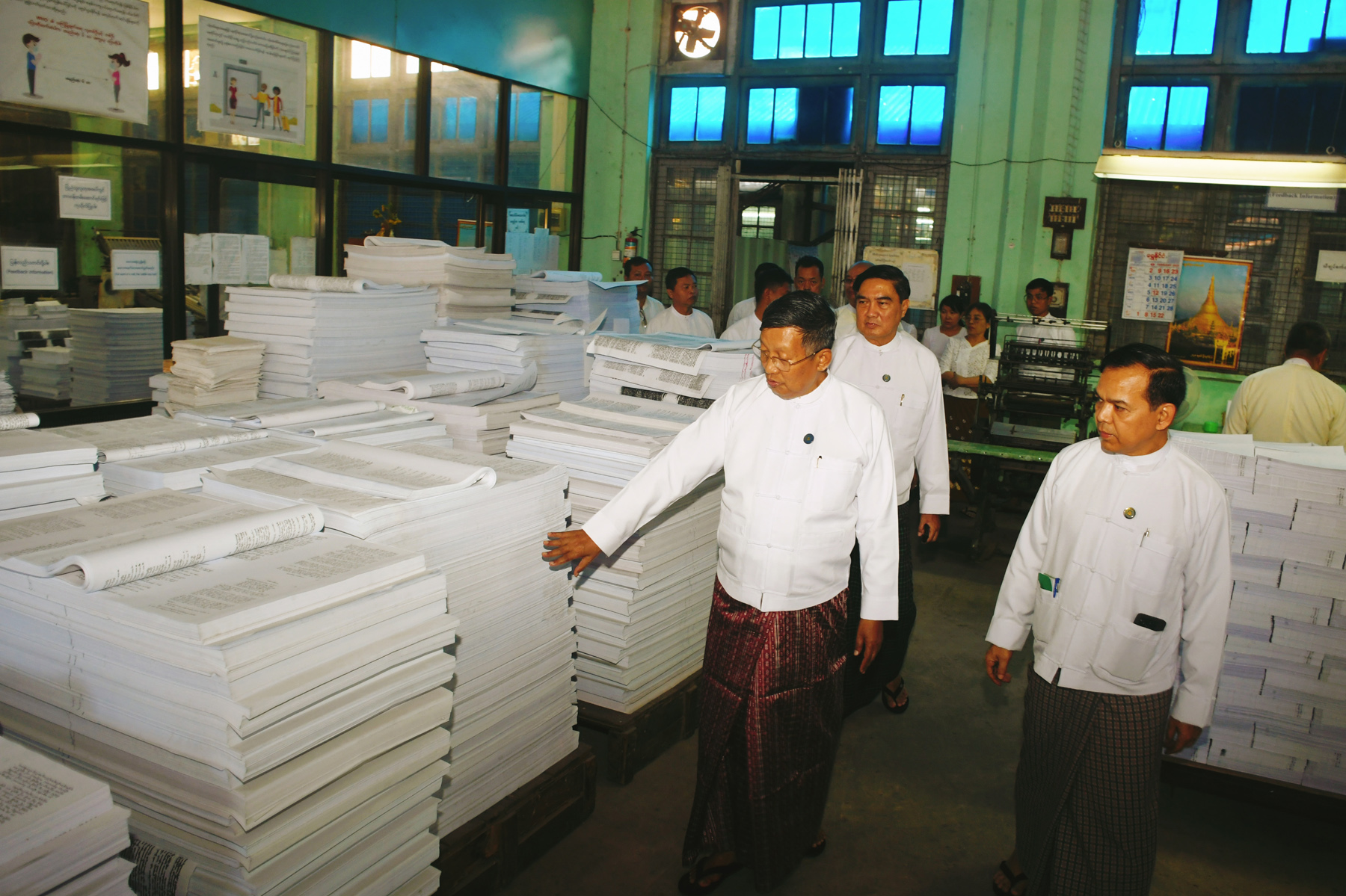ကြည့်ရှုစစ်ဆေးစဉ် ပြည်ထောင်စုဝန်ကြီးက ပညာရေးဝန်ကြီးဌာနကအပ်နှံသည့် ကျောင်းသုံး ဖတ်စာအုပ်များကို ပုံနှိပ်ရာတွင် ကျောင်းသုံးဖတ်စာအုပ်များ၏ အရည်အသွေး ကောင်းမွန်ရေး အတွက် သတ်မှတ်ထားသည်စက္ကူ၊ အပြင်အဆင်စာအုပ်အရွယ် အချိုးအစားများ မှန်မှန်ကန်ကန် ဖြစ်စေရေး ပညာရေးဝန်ကြီးဌာနသို့ ပေးပို့အပ်နှံရမည့် အချိန်ကာလအမီ ဝန်ထမ်းများ အဆင့်ဆင့်က အလေးအနက်ထားကာ ကြပ်မတ်စိစစ်ဆောင်ရွက်ရေးနှင့် လုပ်ငန်းဆိုင်ရာ စရင်းဇယားများကို သတ်မှတ်ချက်များအတိုင်း ပြည့်စုံအောင်ပြင်ဆင် ဆောင်ရွက်ရေး၊ သတ်မှတ်ကာလ အလိုက် အချိန်မီပြီးစီးစေရေးကို ကြိုးစားဆောင်ရွက်သွားကြရန် တာဝန်ရှိသူများကို မှာကြားသည်။