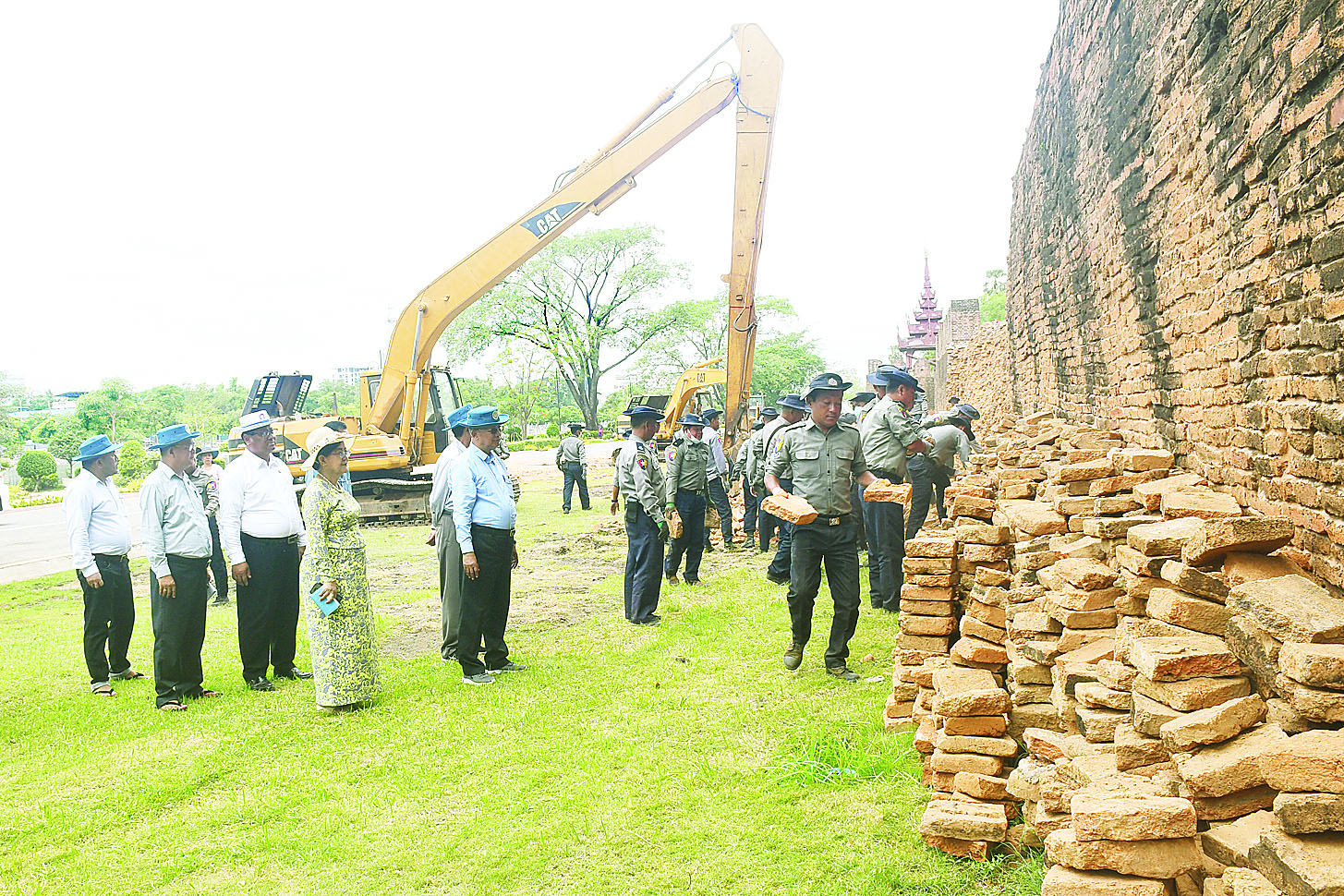 ပြည်ထောင်စုဝန်ကြီးနှင့် အဖွဲ့ သည် ငလျင်ဒဏ်ကြောင့် ထိခိုက်ပျက်စီးခဲ့သော နန်းမြို့ဆုတောင်း ပြည့်စေတီတော်၊ စွယ်တော်စင်နှင့် ဥပုသ်တော်ဆောင်တို့ ပြန်လည်ပြုပြင်ထိန်းသိမ်းနေမှုကို လည်းကောင်း၊ ပဟိုရ်စင်ပျက်စီးမှုနှင့် ယာယီ အမိုးပြုလုပ်ထားမှုကို လည်းကောင်း၊ ငလျင်ဒဏ်ကြောင့် ထိခိုက်ပျက်စီးခဲ့သော မြနန်းစံကျော် ရွှေနန်းတော်ကြီးကို လည်းကောင်း၊ ငလျင်ဒဏ်ကြောင့် ထိခိုက်ပျက်စီးခဲ့သည့် နန်းမြို့ရိုး ၄၈၃၉ ပေ၊ သူရဲခို ၁၂၅၅ လုံး၊ မြို့ရိုး ဝင်ပေါက်ပြအိုးနှင့် ပြာသာဒ်ဆောင် ကိုးခု၊ မီးတား ၁၂ ခုတို့မှ အုတ်ကျိုးအပိုင်းအစများ၊ နံရံ အောက်ခြေရှိ အုတ်ခဲကျိုးအပိုင်းအစများကို အပြီးသတ်ရှင်းလင်းခြင်း၊ သစ်သားပြာသာဒ်များ၏ ထီးတော်တိမ်းစောင်းမှုများ တည့်မတ်ခြင်း လုပ်ငန်းများကို တပ်မတော်မှ အရာရှိ၊ အရာခံ စစ်သည်များ၊ မြန်မာနိုင်ငံရဲတပ်ဖွဲ့နှင့် ရှေးဟောင်း သုတေသနနှင့် အမျိုးသားပြတိုက်ဦးစီးဌာနမှ ဝန်ထမ်းများ ပူးပေါင်းဆောင်ရွက် နေမှုများကိုလည်းကောင်း၊ ငလျင် ဒဏ်ကြောင့် ထိခိုက်ပျက်စီးခဲ့သည့် မဟာမုနိဘုရားအာရုံခံတန်ဆောင်း၊ မုခ်ဦးများ ရှင်းလင်းထိန်းသိမ်းမှုများကို လည်းကောင်း၊ အာနန္ဒာဘုရား၊ ဘုရားနီဘုရား၊ အရိပ် မထွက်ဘုရားနှင့် နိုင်ငံတော် ပရိယတ္တိတက္ကသိုလ် (မန္တလေး) ဘွဲ့နှင်းသဘင်ခန်းမ ပျက်စီးမှုအခြေအနေများကိုလည်းကောင်း လှည့်လည် ကြည့်ရှုစစ်ဆေးပြီး ပြည်ထောင်စုဝန်ကြီးက လိုက်နာ ဆောင်ရွက်ရန် လိုအပ်သည့် လုပ်ငန်းပိုင်းဆိုင်ရာများကို မှာကြားသည်။