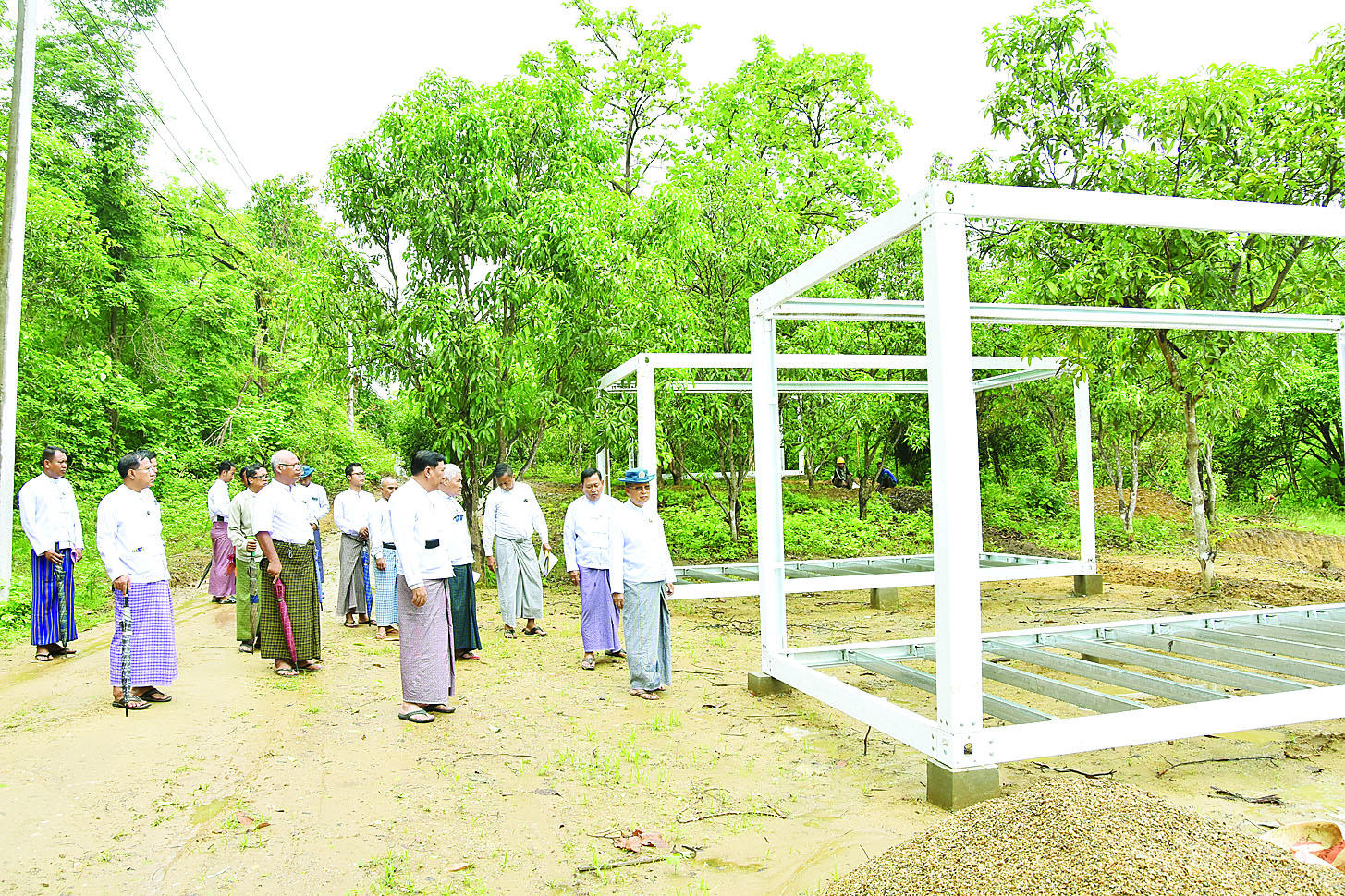 ဦးစွာ ပြည်ထောင်စုဝန်ကြီးနှင့်အဖွဲ့သည် နေပြည်တော်ရုံးအမှတ် (၃၁) သာသနာရေးနှင့် ယဉ်ကျေးမှုဝန်ကြီးဌာန ရုံးဝင်းအတွင်းရှိ ဝန်ကြီးရုံး (သာသနာရေး)မှ အရာထမ်း၊ အမှုထမ်းများနှင့် ဝန်ထမ်းမိသားစုဝင်များ ယာယီနေထိုင်ရန်အတွက် ပေ(၁၀ x ၂၀)အရွယ်အစားရှိ Container House များ တပ်ဆင်တည်ဆောက်နေမှု၊ Footing Block များ ဆောင်ရွက်ပြီးစီးမှု၊ အင်ကြင်းရိပ်သာတွင် 1 Unit ငါးလုံး၊ ရွှေတမာရိပ်သာတွင် 1 Unit ၁၁ လုံး နှင့် 2 Unit လေးလုံး၊ ရွှေညောင်ပင်ရိပ်သာတွင် 1 Unit အလုံး ၂၀ နှင့် 2 Unit လေးလုံး တပ်ဆင်တည်ဆောက်နေမှုအခြေအနေများ၊ ဝန်ထမ်းများအသုံးပြုရန်အတွက် ရေစုကန်တူးဖော်နေမှုနှင့် စက်ရေတွင်းတူးဖော်နေမှုအခြေအနေများ၊ ရေပိုက်လိုင်းနှင့် မီးလိုင်းများ သွယ်တန်းတပ်ဆင်နေမှုအခြေအနေများကို ကြည့်ရှုစစ်ဆေးသည်။