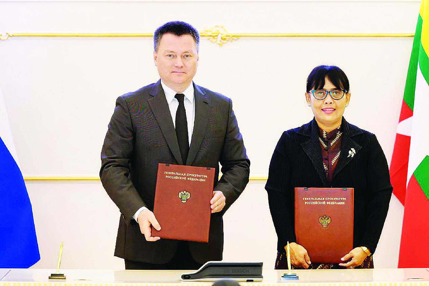 ဆက်လက်၍ နိုင်ငံသားများအား အပြည်ပြည်ဆိုင်ရာ တရားစီရင်ရေးအလွဲသုံးစားပြုလုပ်၍ တရားစီရင်ခြင်းမှ အပြန်အလှန်အကာအကွယ်ပေးရေး ဆိုင်ရာသဘောတူစာချုပ်၏ လုပ်ထုံးလုပ်နည်း များဆိုင်ရာ နောက်ဆက်တွဲစာချုပ် လက်မှတ်ရေးထိုးခြင်း အခမ်းအနားကို ဆက်လက်ကျင်းပရာ ပြည်ထောင်စုဝန်ကြီးနှင့် ပြည်ထောင်စုရှေ့နေချုပ် ဒေါက်တာသီတာဦးနှင့် ရုရှားဖက်ဒရေးရှင်း နိုင်ငံရှေ့နေချုပ် H.E. Mr. IGOR KRASNOV တို့ကတက်ရောက်၍ စာချုပ်ကို လက်မှတ်ရေးထိုး ခဲ့ကြသည်။