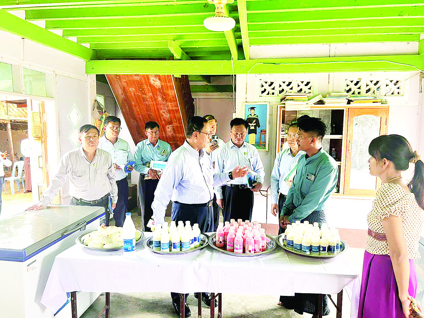 သမဝါယမနှင့်ကျေးလက်ဖွံ့ဖြိုးရေးဝန်ကြီးဌာန ပြည်ထောင်စုဝန်ကြီး ဦးလှမိုးသည် ယနေ့မွန်းလွဲပိုင်း က မန္တလေးတိုင်းဒေသကြီး မိတ္ထီလာခရိုင် မိတ္ထီလာမြို့နယ် မကျီးပင်ပုကျေးရွာ၌ မြစိမ်းရောင်ကျေးရွာ စီမံကိန်းရန်ပုံငွေများဖြင့် အစုအဖွဲ့လေးဖွဲ့မှ နို့စားနွားမွေးမြူရေးလုပ်ငန်း ဆောင်ရွက်နေမှု အခြေအနေများကို ကြည့်ရှုစစ်ဆေးသည်။