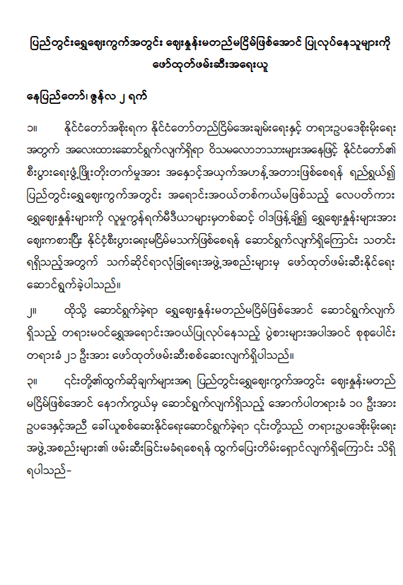 ပြည်တွင်းရွှေဈေးကွက်အတွင်း ဈေးနှုန်းမတည်မငြိမ်ဖြစ်အောင် ပြုလုပ်နေသူများကို ဖော်ထုတ်ဖမ်းဆီးအရေးယူ