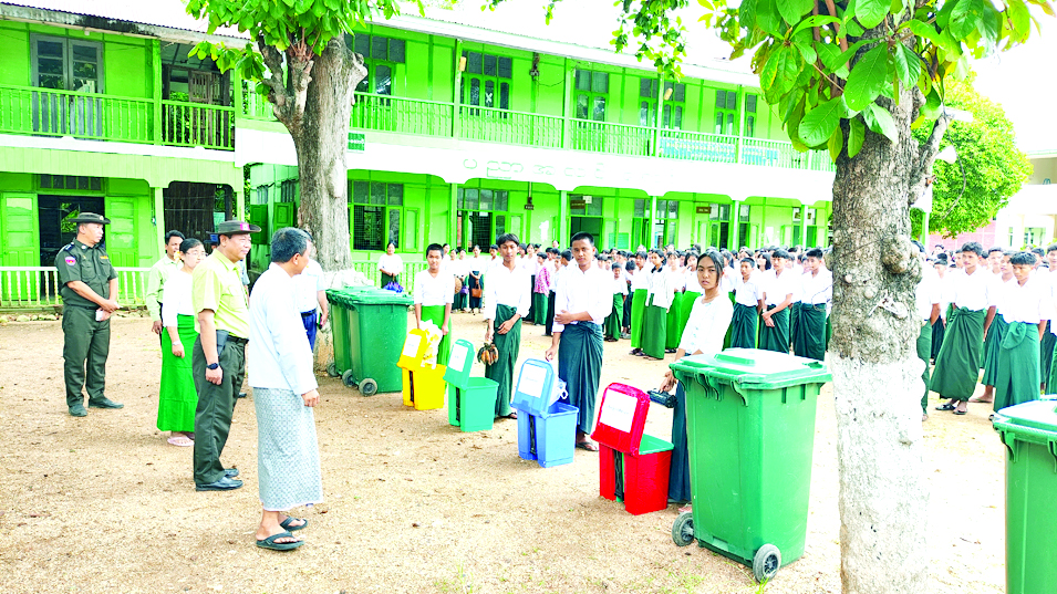 ပဲခူးတိုင်းဒေသကြီး ပန်းတောင်းမြို့နယ် အထွေထွေအုပ်ချုပ်ရေးဦးစီးဌာနရုံးဝင်းအတွင်းနှင့် အထက (ပန်းတောင်း) ကျောင်းတွင် ဇွန် ၁၆ ရက် နံနက်ပိုင်းက သဘာဝပတ်ဝန်းကျင်ထိန်းသိမ်း ကာကွယ်နိုင် စေရေး၊ မြို့နယ်သန့်ရှင်းသာယာလှပစေရေး အမှိုက်များစနစ်တကျစွန့်ပစ်ကြရန် အမှိုက် အမျိုးအစား အလိုက် အမှိုက်ပုံး အရောင်သတ်မှတ်၍ခွဲခြားစွန့်ပစ်ခြင်း သရုပ်ပြ လေ့ကျင့်ခြင်းပြုလုပ်သည်။